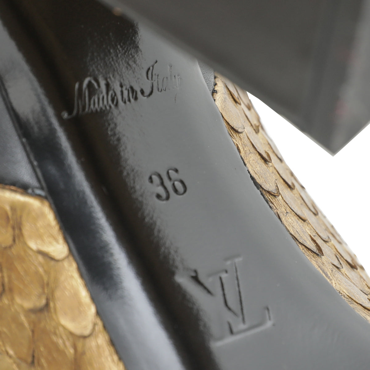 - Material: Black Leather with Gold Python and Monogram Canvas Tab Detail