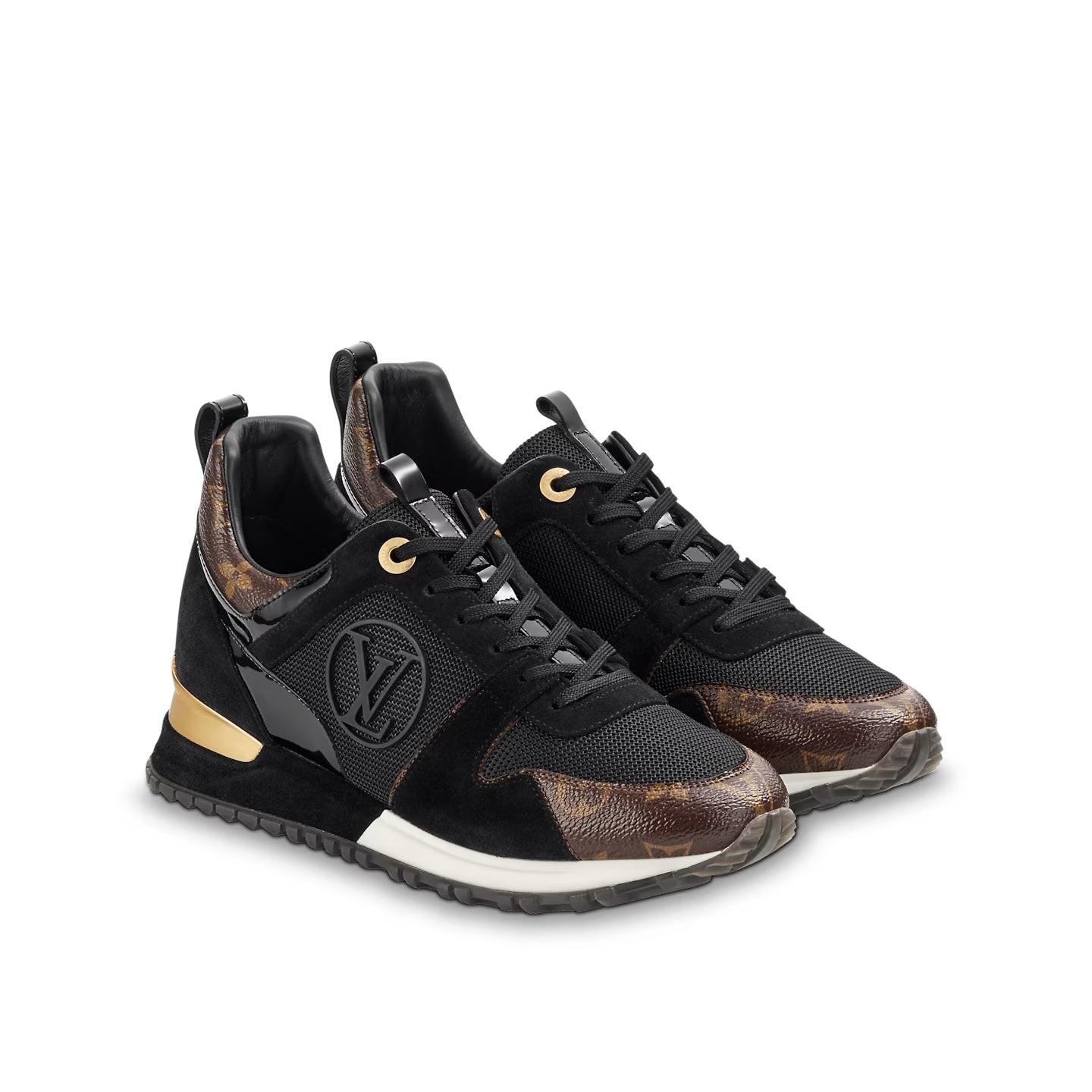 An oversize LV Circle signature adorns the side of the Run Away sneaker in black or white suede calf leather with iconic Monogram-canvas trim. This advanced design features a technical outsole with a hidden fusbet for extra height and an eye-catching gold-tone metal stabilizer.
