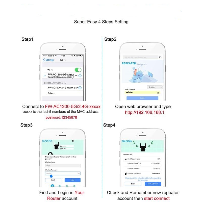 This WiFi extender can be used with any 802.11b/g/n/a/ac wireless Internet router, which means it works with any standard router or gateway. It can easily extend the wireless coverage by pressing the WPS button. Or set up via browser website(192.168.188.1) on almost any devices, including Windows/Android/iOS mobile platforms.