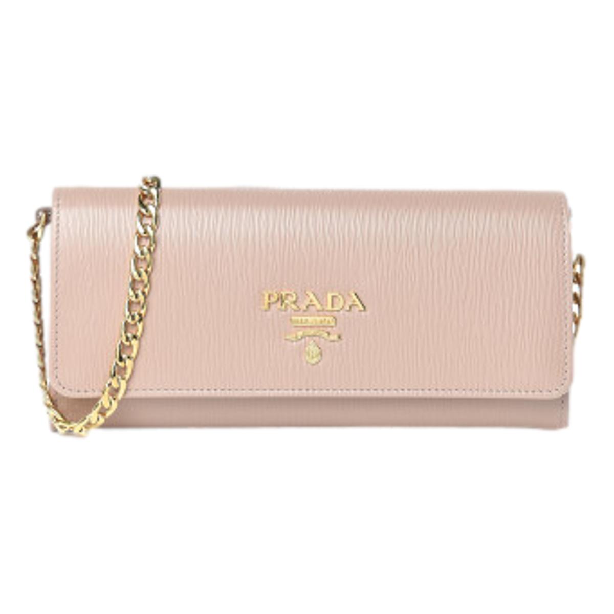 Elevate your look with this Prada Vitello Move chain wallet! This piece is crafted from Cipria beige calfskin leather, featuring the iconic gold Prada logo on the front face. The flap opens to a leather interior containing a zipper pocket, three bill slots, and six card slots. Wear this bag as a crossbody or remove the strap for an elegant clutch.