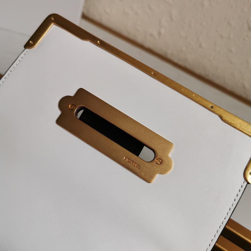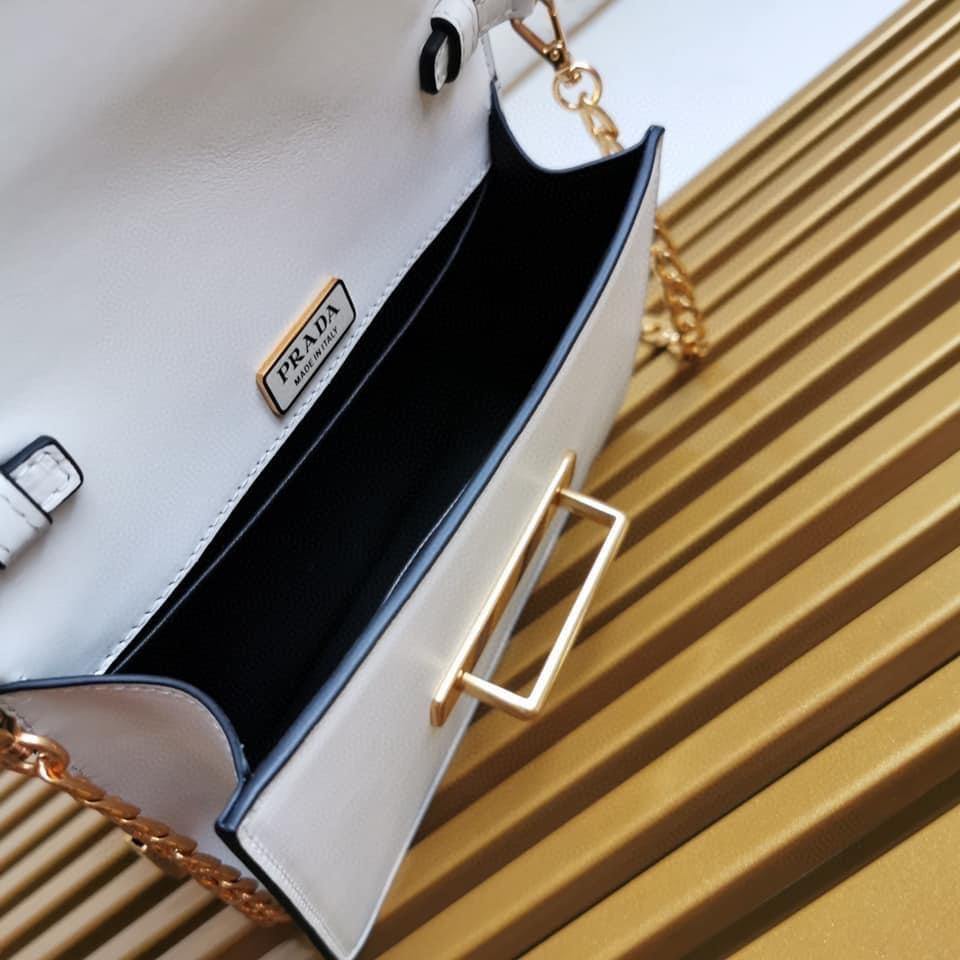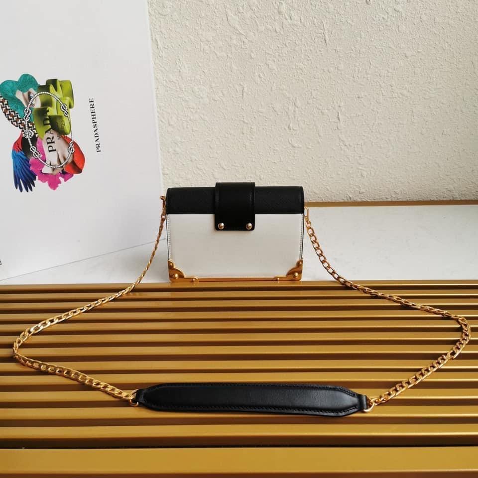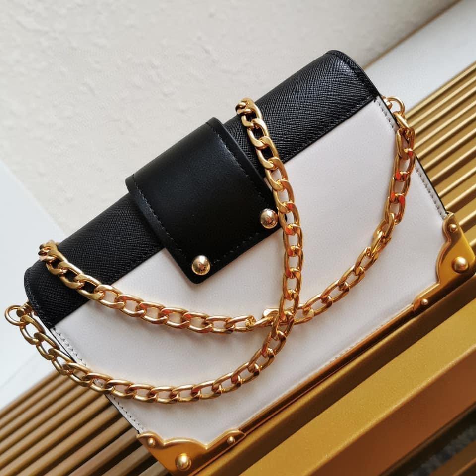 Made of calf leather, it is defined by the metal hardware decorating the front and shoulder strap.
