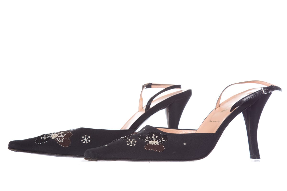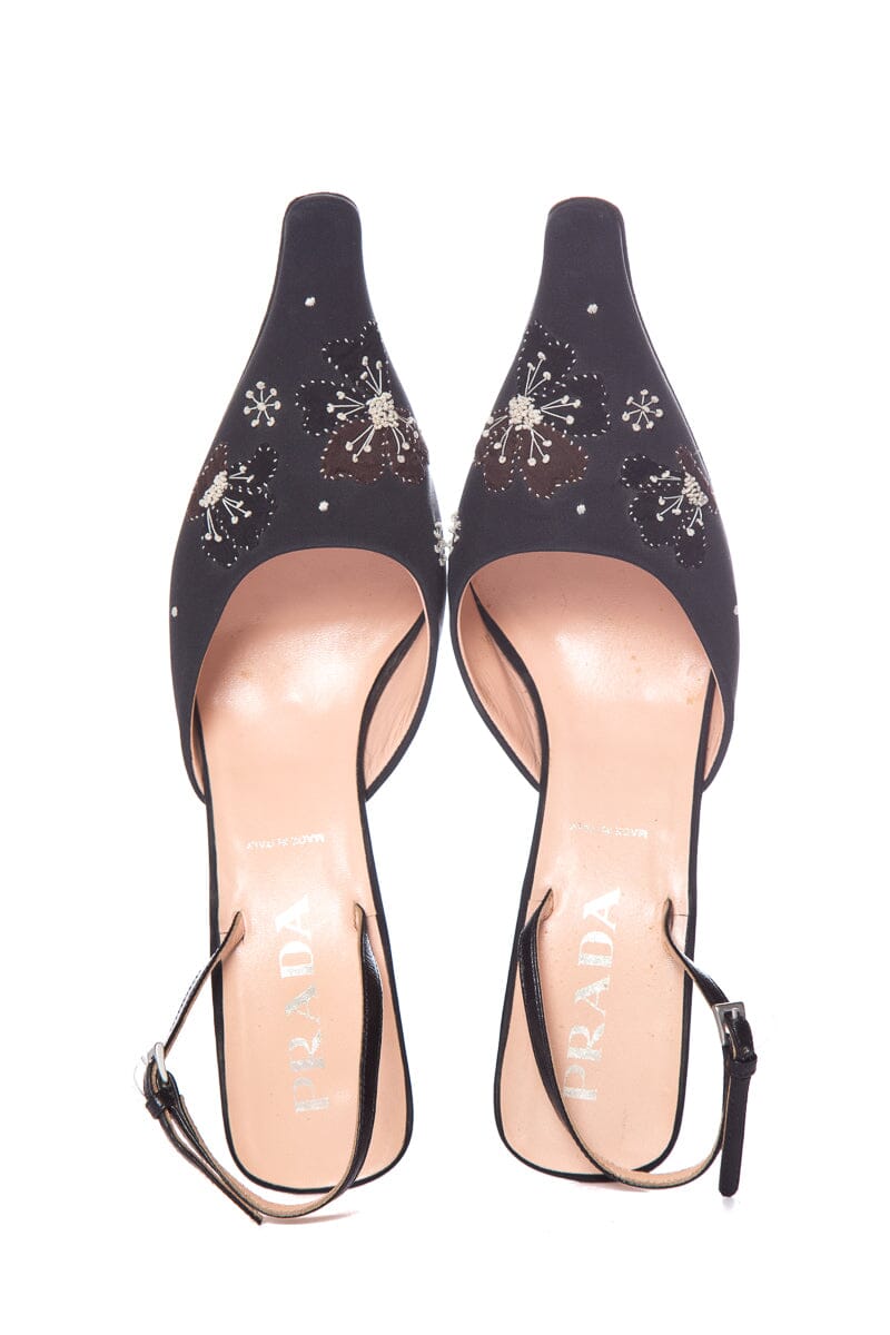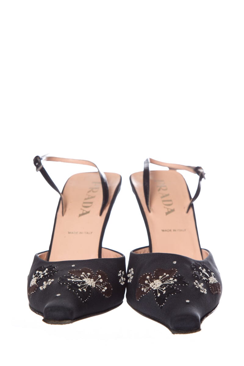 Prada woven canvas, semi-pointed toe pumps with creme and chocolate embroidered floral embellishments at vamps, covered heels and silver-tone buckle closures at slingback ankle straps.