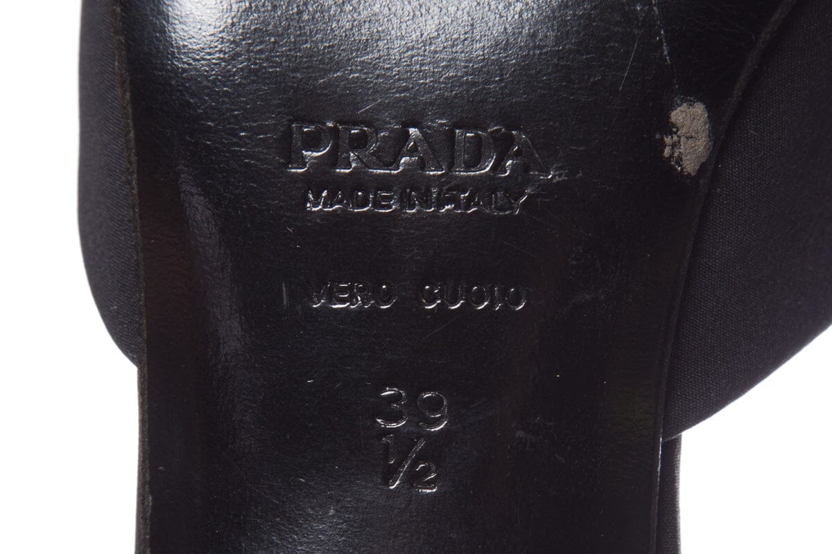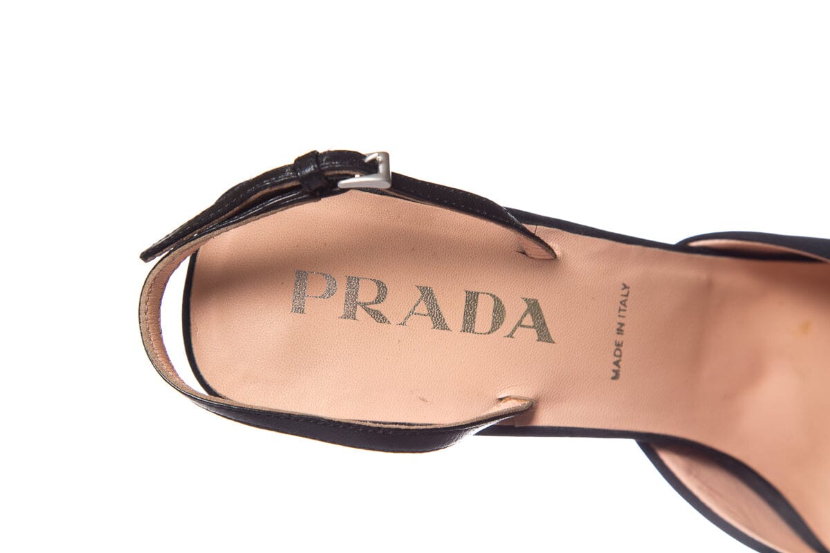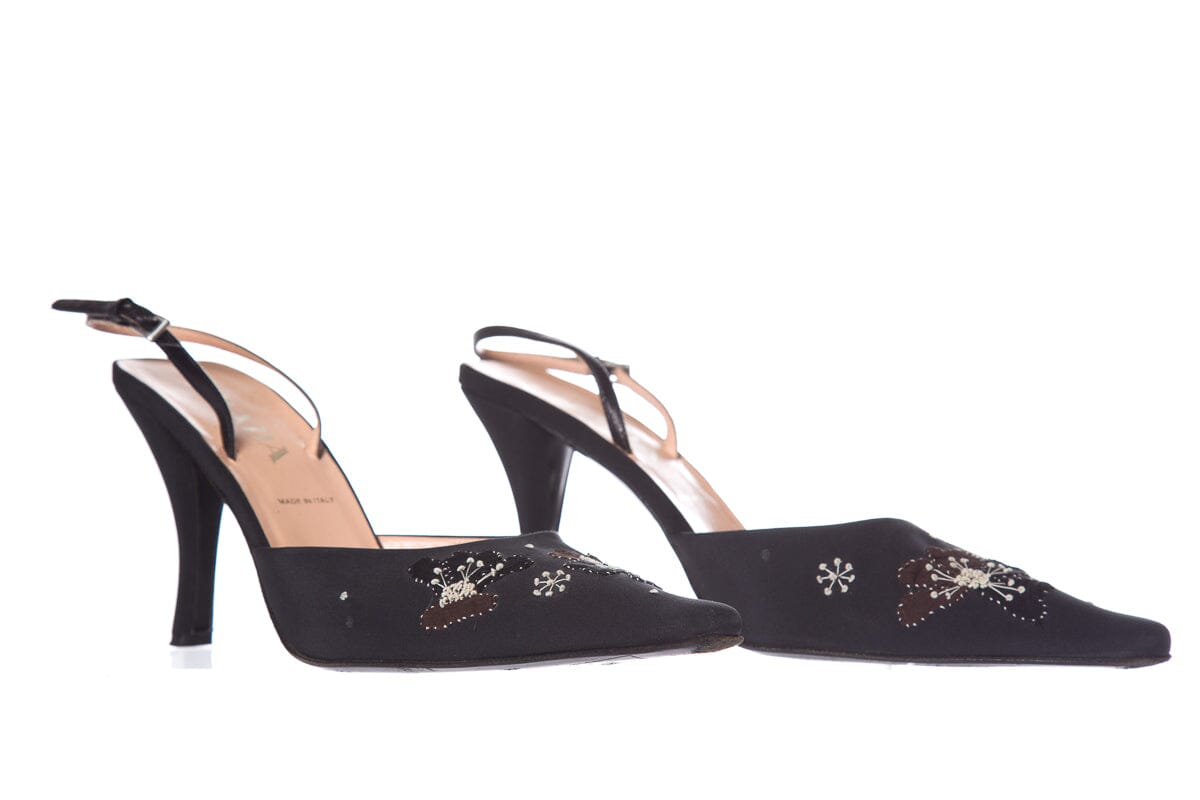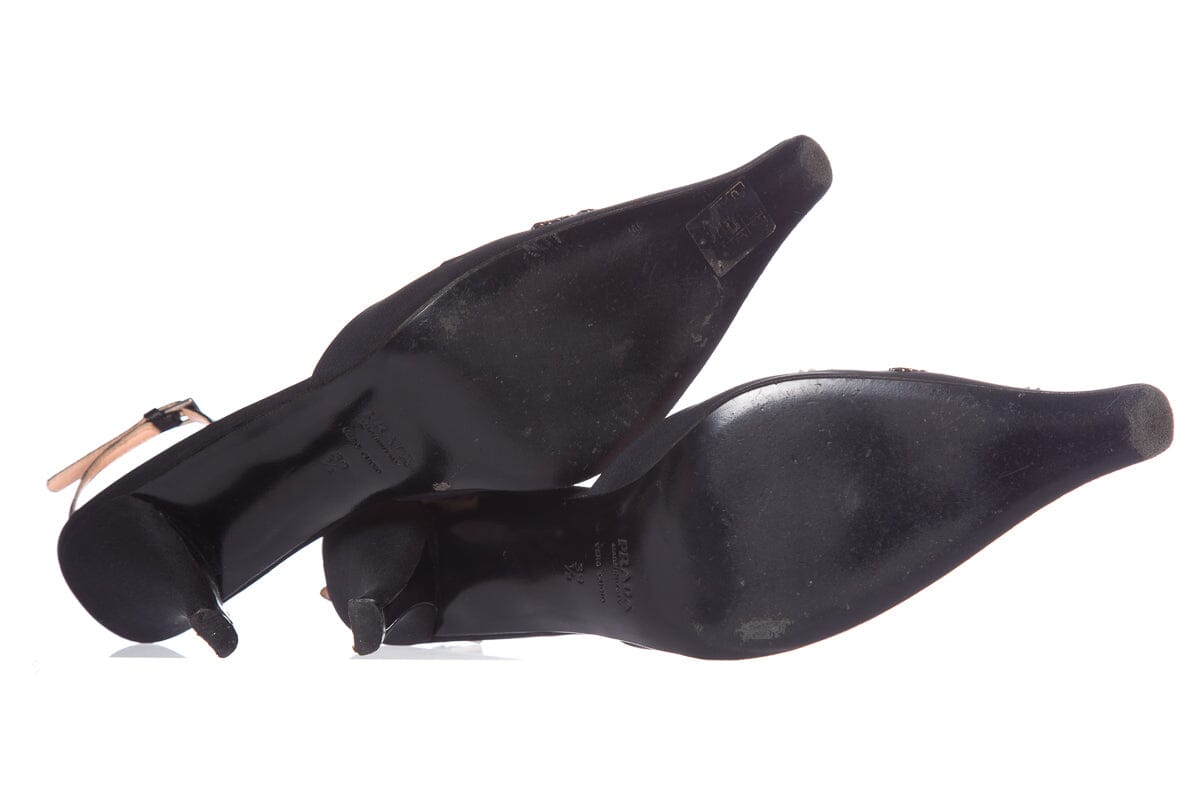 Prada woven canvas, semi-pointed toe pumps with creme and chocolate embroidered floral embellishments at vamps, covered heels and silver-tone buckle closures at slingback ankle straps.