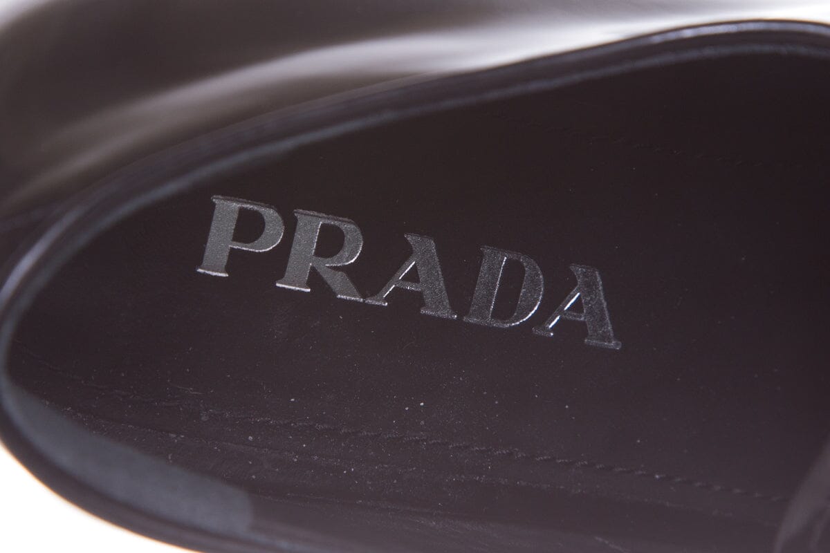 Prada Black Leather Heel Derby Loafers. This item is in very good condition with some wear to soles and small scuff on tip.