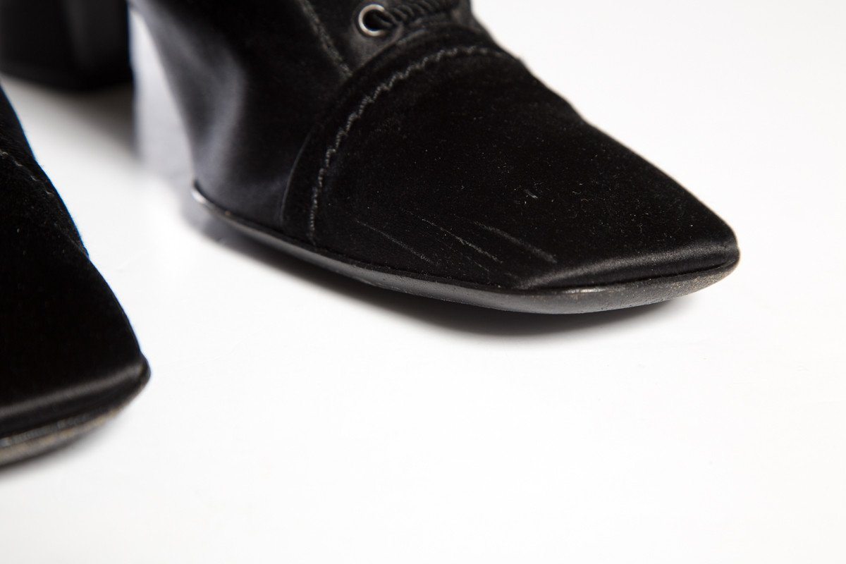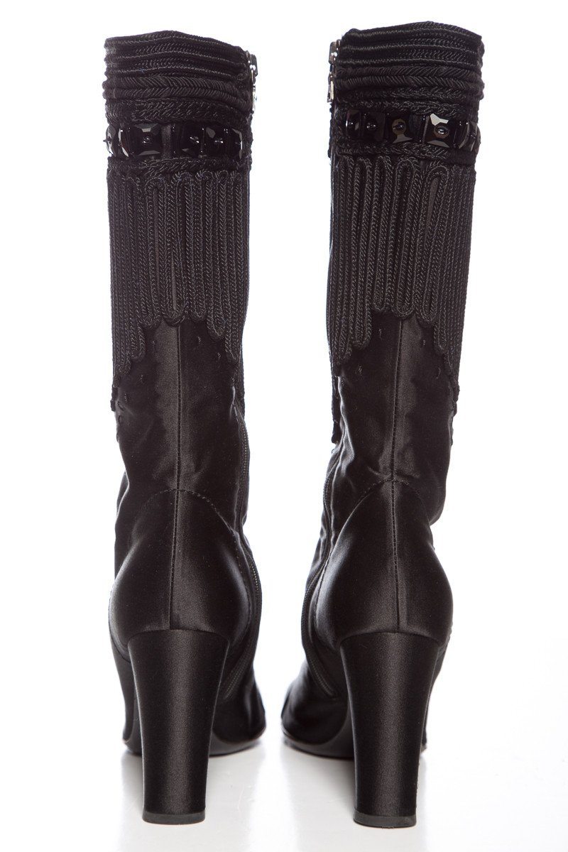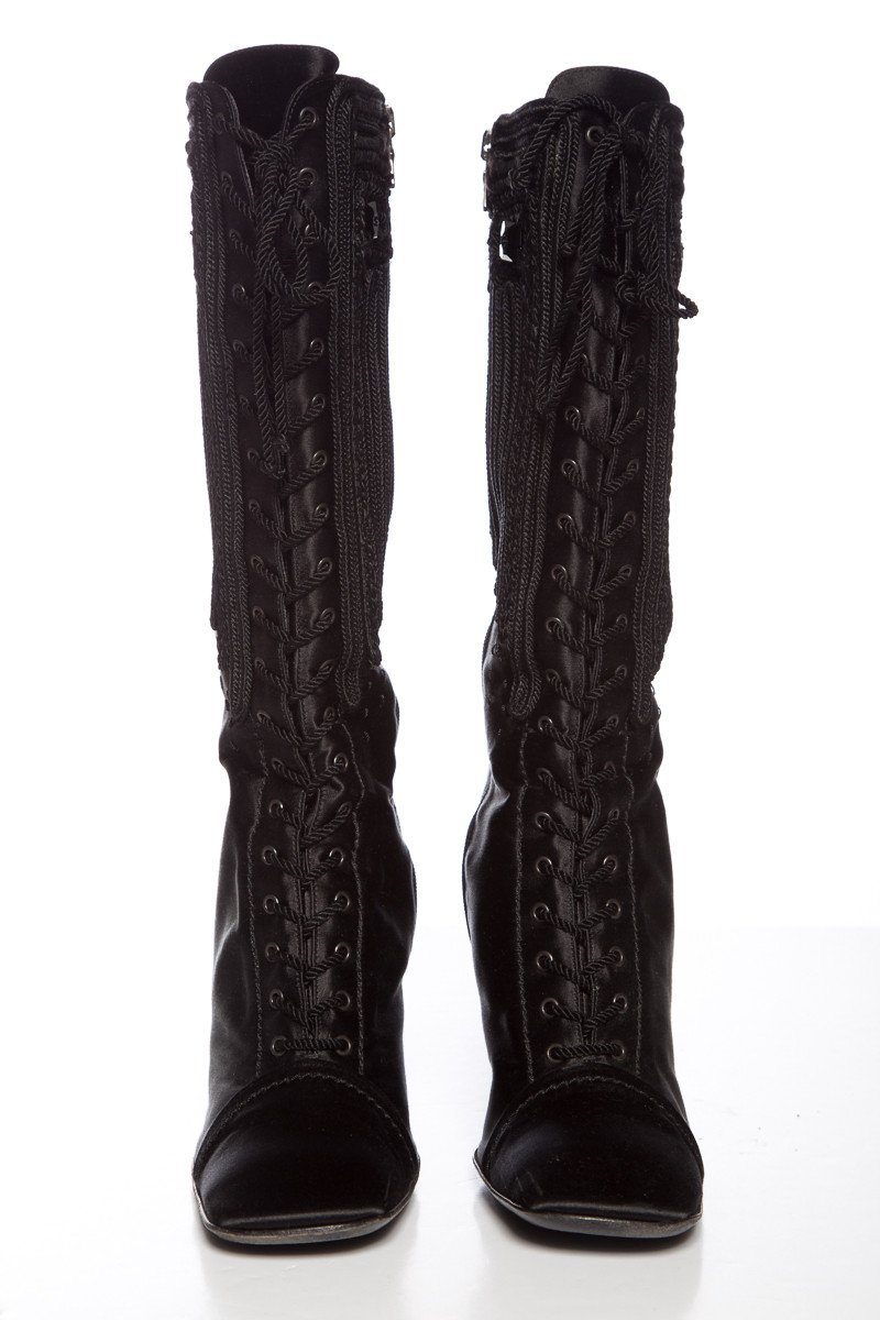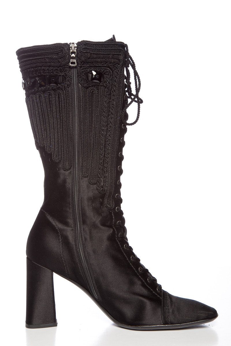 Prada Black Satin Lace Up Boots With Square Toe, Braided Rope Embroidery, Square Black Sequin Detailing At Top, Zip Closure Along The Inside Of boot, Slight Wear To Left Toe