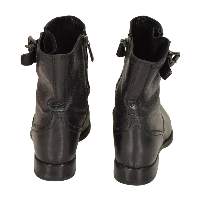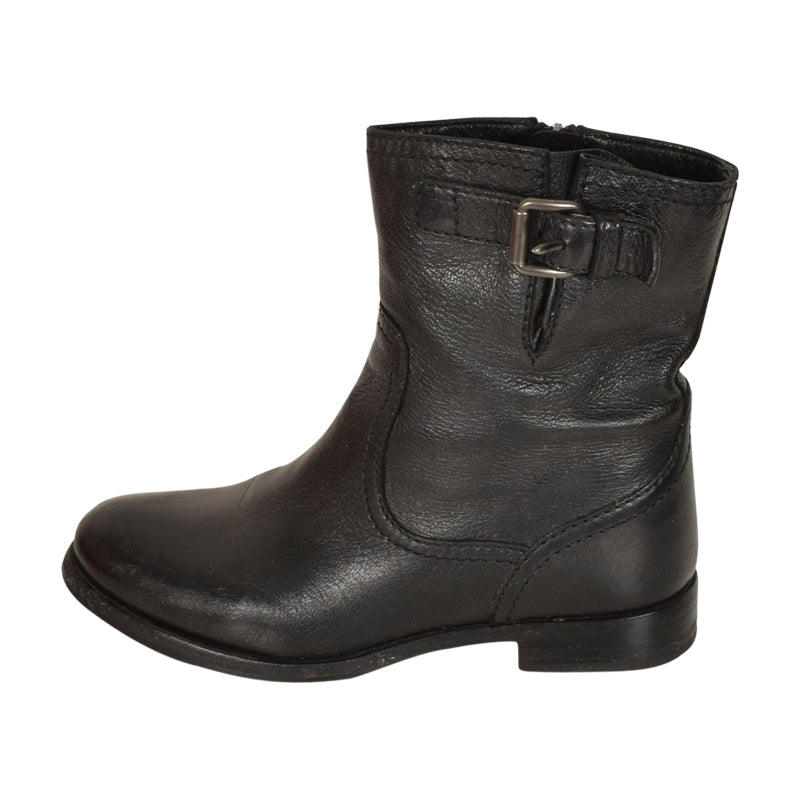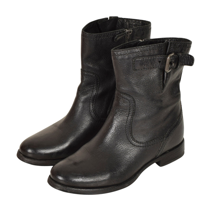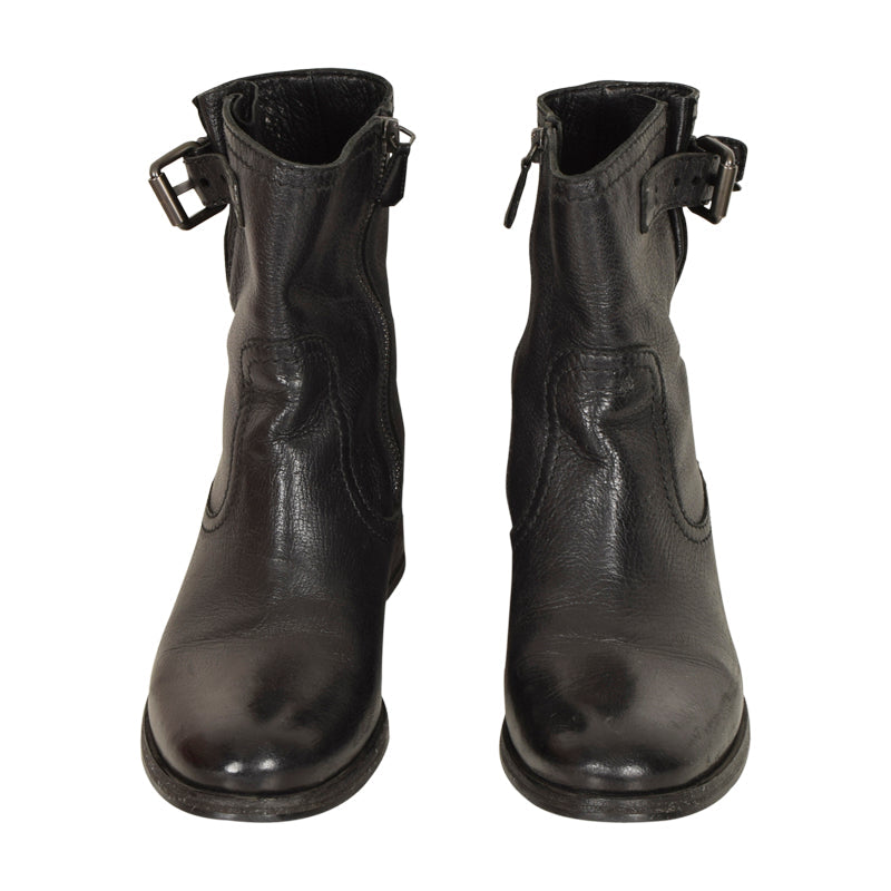 Prada black leather moto boot with buckle detailing and stacked heel. Includes box and dust bag.