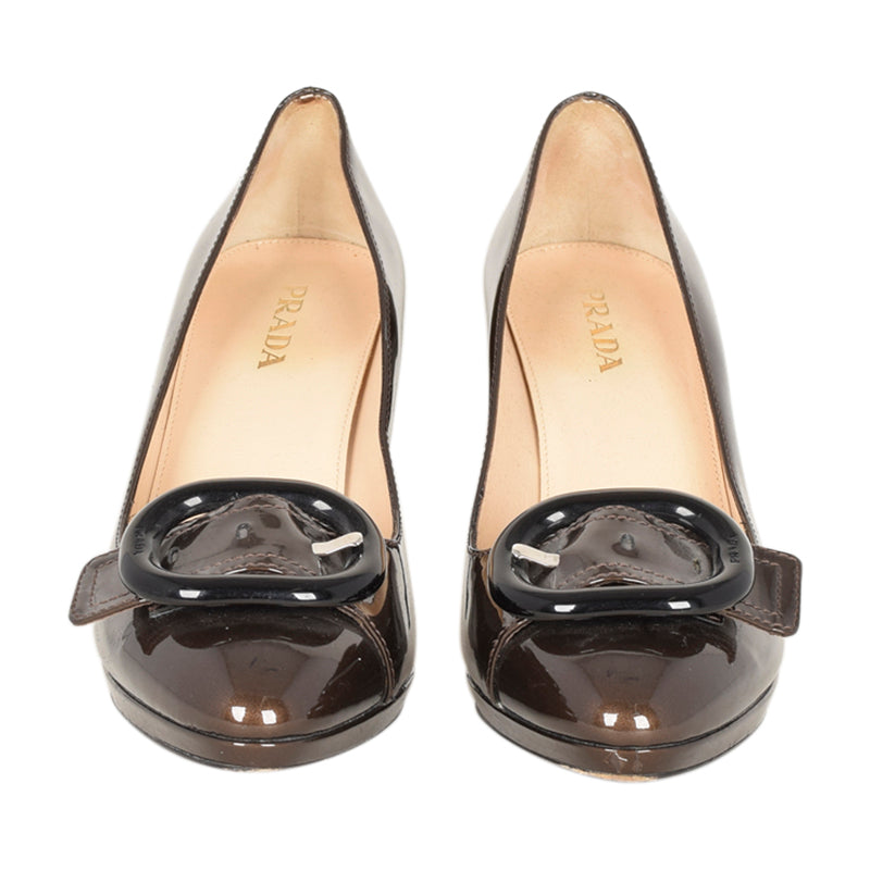 Prada brown patent leather pointed-toe platform pumps with buckle detailing at vamps and covered heels. Includes dust bag.