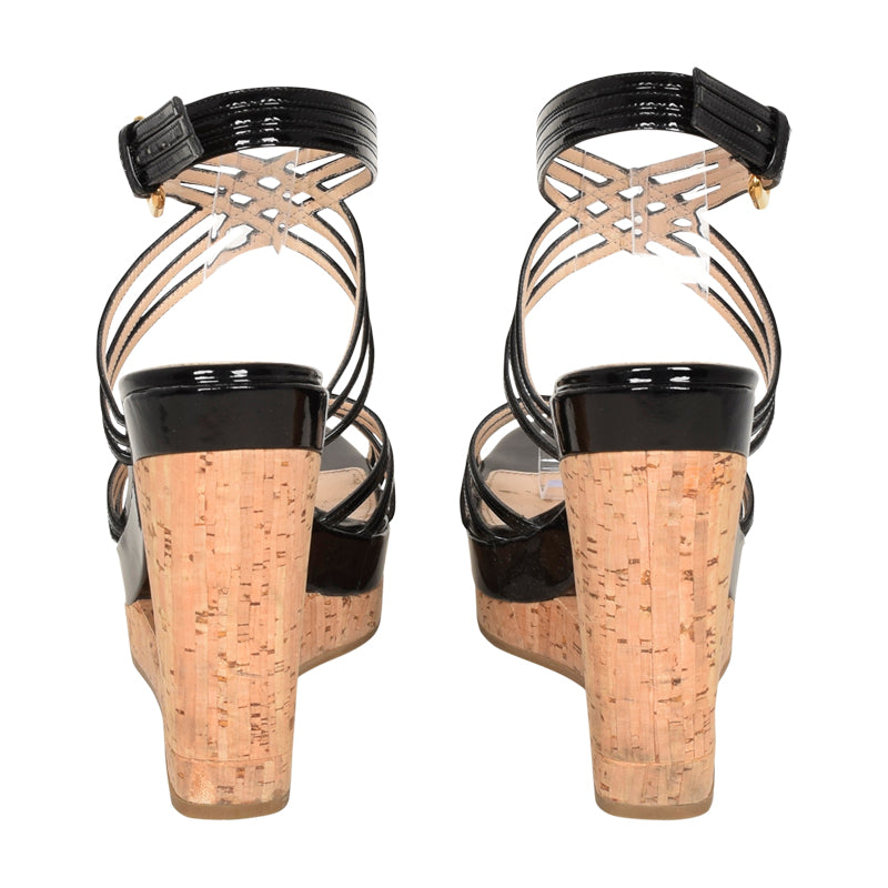 Prada black patent leather platform sandal with cork wedges and exterior ankle buckle closure. Includes box.
