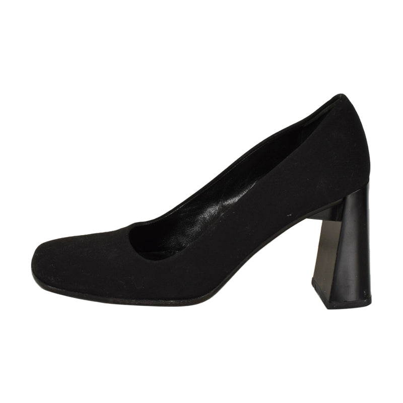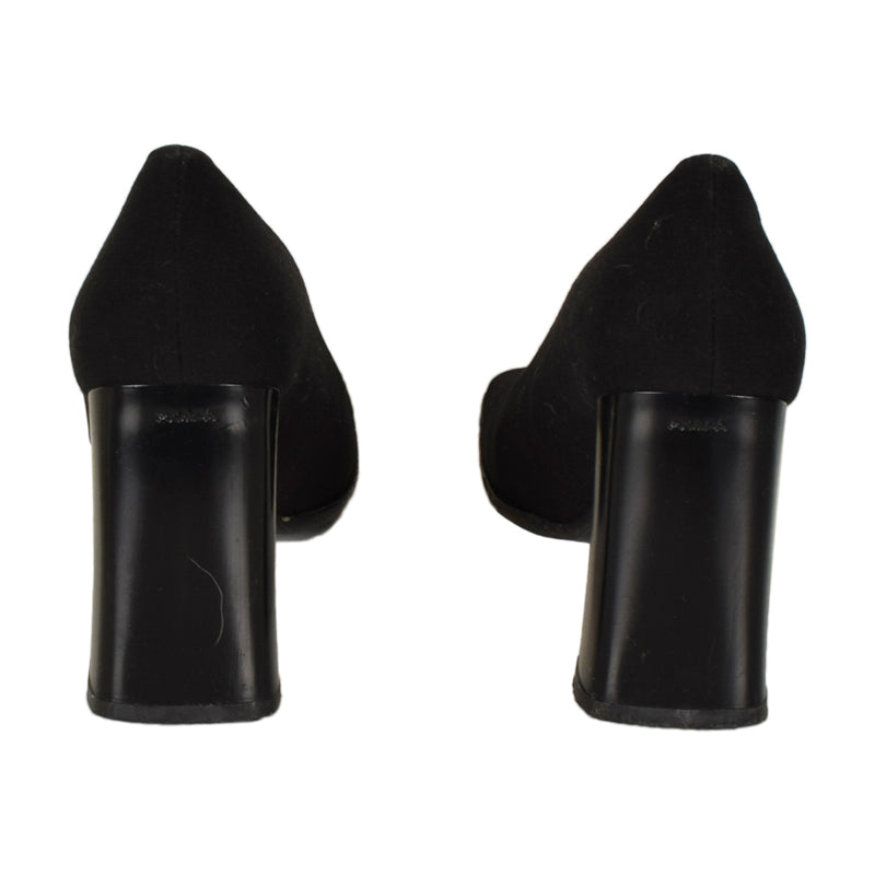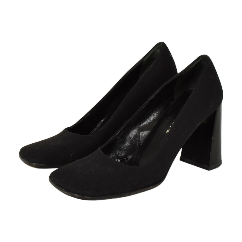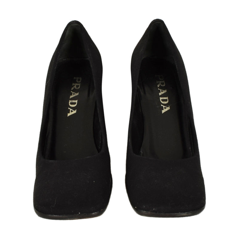 Prada black woven pumps with square toes, block heels. Pads left in shoes.