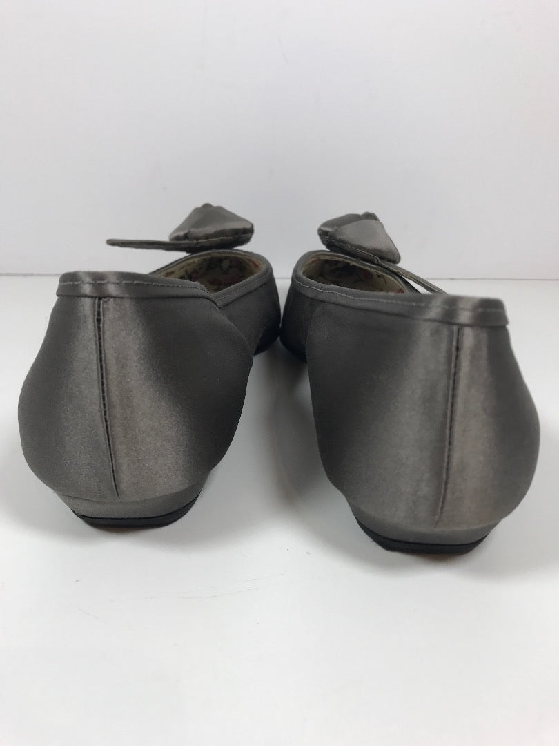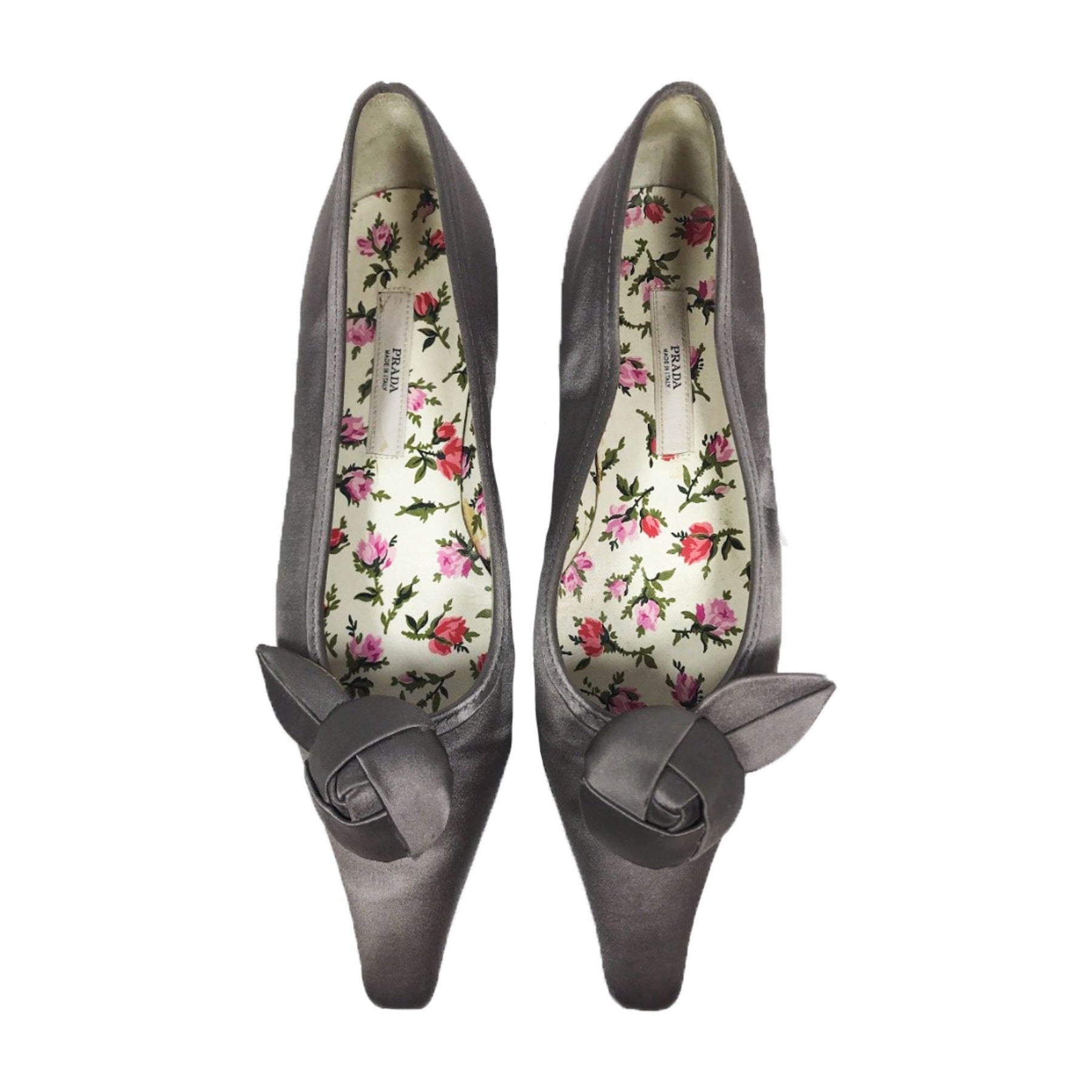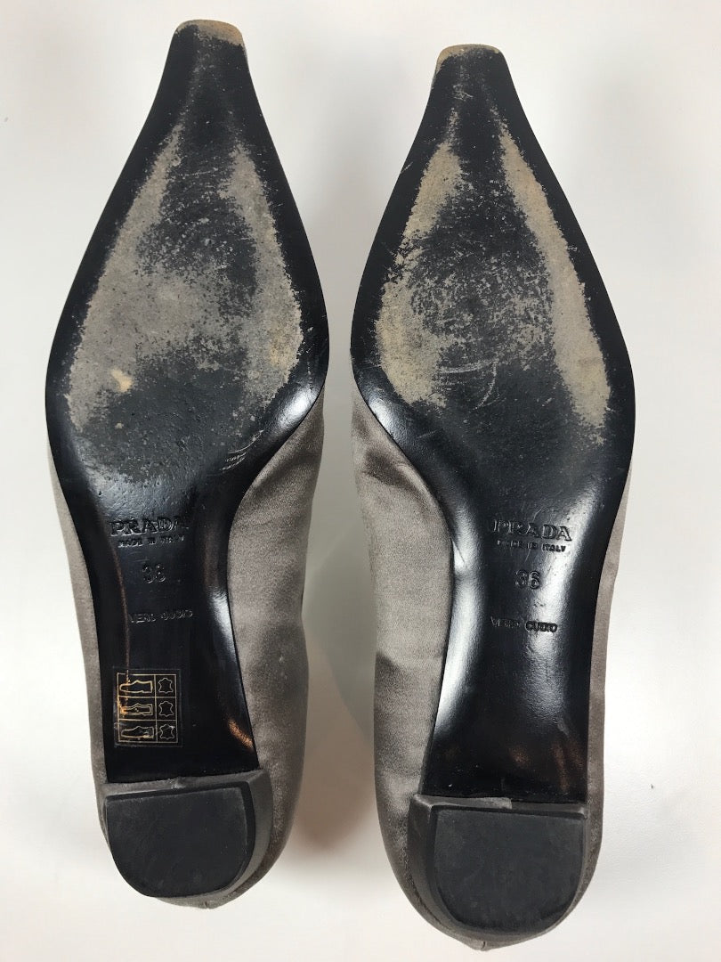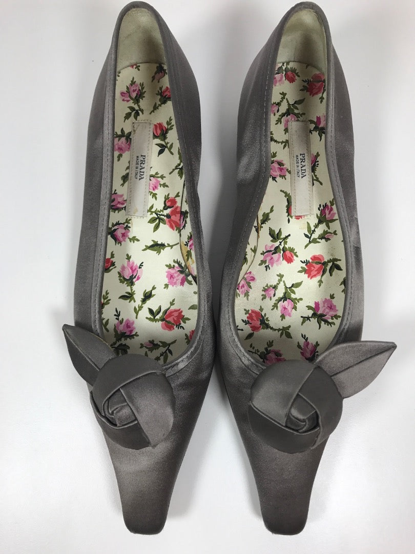 Silver Flats with Flower Details Made by Prada. These flats are in good condition. Light signs of scuff at top of flats. The left flat is laying a little weird, but can be fixed my keeping them stuffed or with regular wearing.