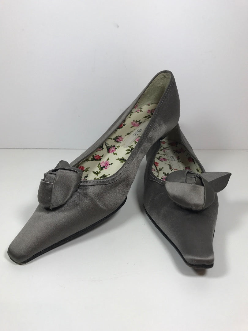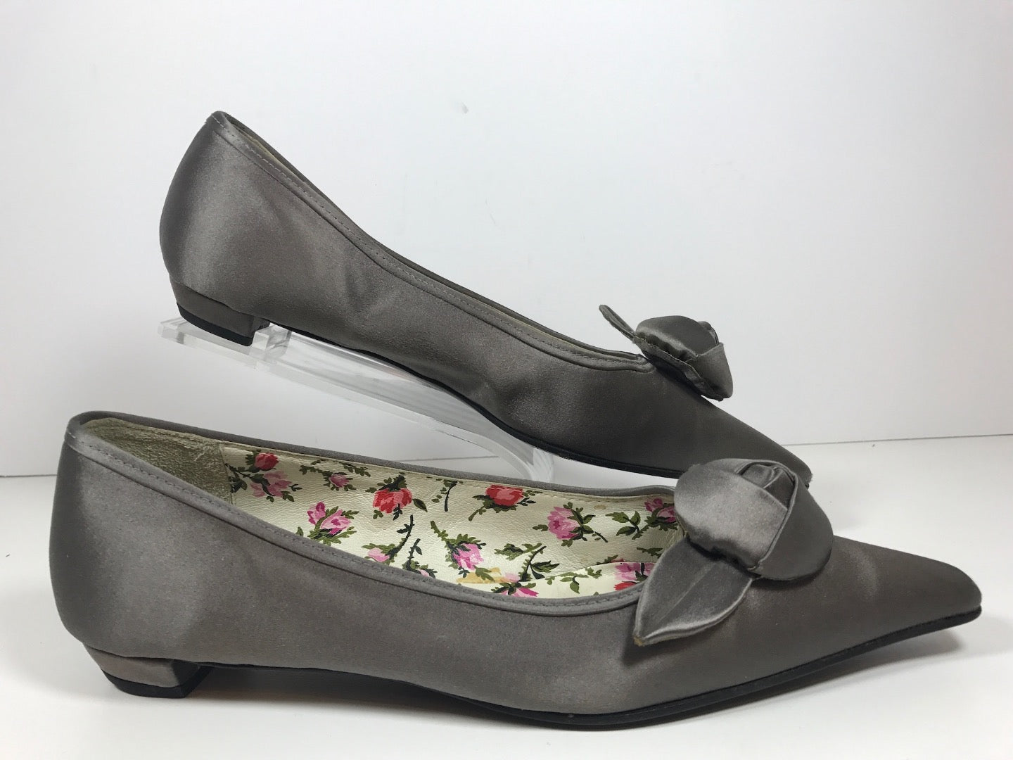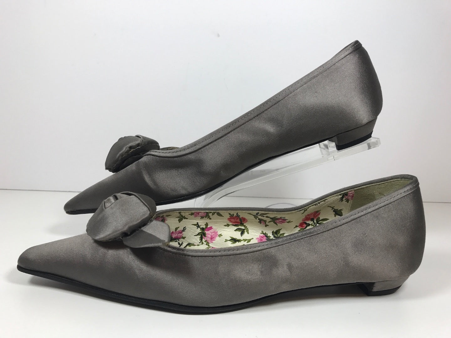 Silver Flats with Flower Details Made by Prada. These flats are in good condition. Light signs of scuff at top of flats. The left flat is laying a little weird, but can be fixed my keeping them stuffed or with regular wearing.