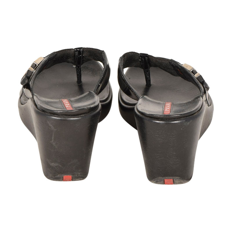 Prada Sport black leather platform wedge sandals with canvas straps, buckle detailing and rubber soles. Includes box.