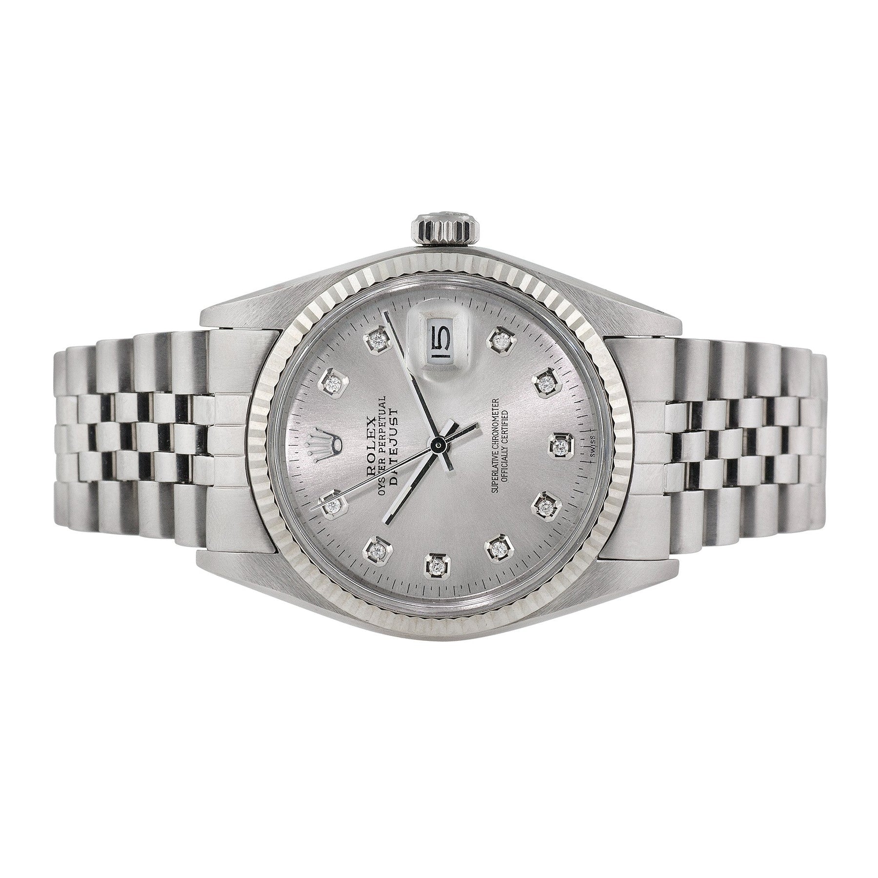 Stainless Steel case with a Stainless Steel Jubilee bracelet and 18K White Gold Fluted bezel. Silver dial with Custom Diamond markers. Automatic movement. Aftermarket Acrylic crystal. Screw down crown. Case size: 36mm. Band width: 20mm, band length: 7.5 inches. Deployment clasp. Water resistant at 100m Every Rolex watch comes packaged in a generic luxury box. Every Rolex Timepiece come with a 1-year limited warranty from the merchant and a Third-Party Certificate of ity.  Ruumur is an independent company. We are not an authorized dealer, nor are we affiliated with Rolex Watch USA. Rolex is a registered trademark of Rolex Watch U.S.A. and Rolex International. All Rolex watches come with all original parts.