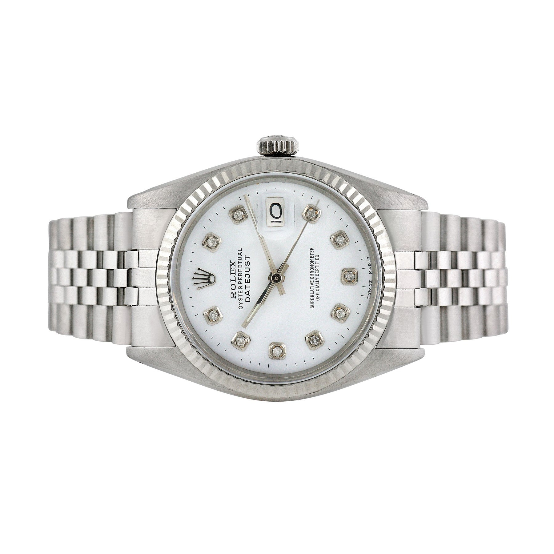 Stainless Steel case with a Stainless Steel Jubilee bracelet and 18K White Gold Fluted bezel. White (Refinished) dial with Custom Diamond markers. Automatic movement. Aftermarket Acrylic crystal. Screw down crown. Case size: 36mm. Band width: 20mm, band length: 7.5 inches. Deployment clasp. Water resistant at 100m Every Rolex watch comes packaged in a generic luxury box. Every Rolex Timepiece come with a 1-year limited warranty from the merchant and a Third-Party Certificate of ity.  Ruumur is an independent company. We are not an authorized dealer, nor are we affiliated with Rolex Watch USA. Rolex is a registered trademark of Rolex Watch U.S.A. and Rolex International. All Rolex watches come with all original parts.