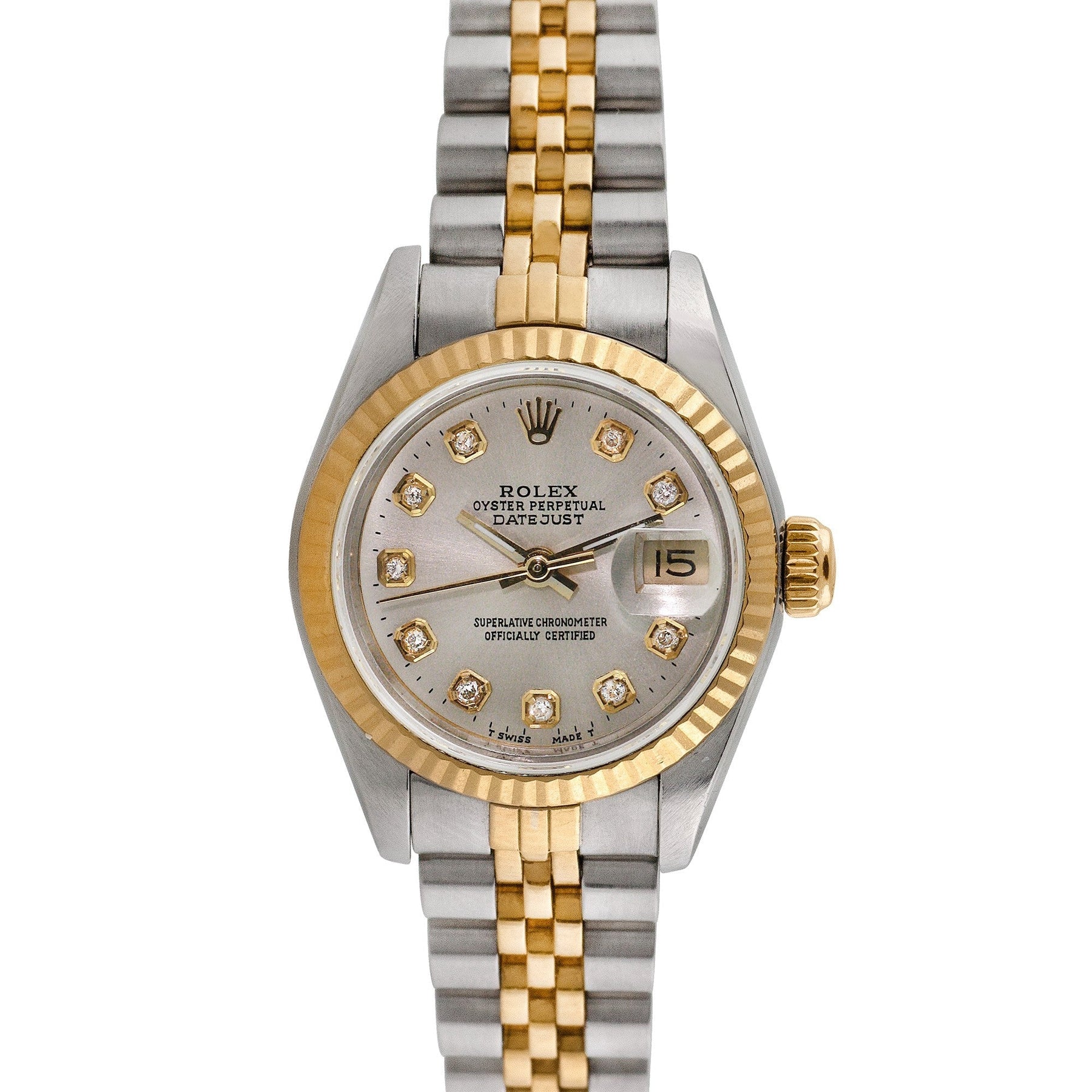 Stainless Steel case with a Stainless Steel and 18K Yellow Gold Jubilee bracelet and 18K Yellow Gold Fluted bezel. Silver dial with Custom Diamond markers. Automatic movement. Aftermarket Sapphire crystal. Screw down crown. Case size: 26mm. Band width: 13mm, band length: 6.5 inches. Deployment clasp. Water resistant at 100m. Every Rolex watch comes packaged in a generic luxury box. Every Rolex Timepiece come with a 1-year limited warranty from the merchant and a Third-Party Certificate of ity.  Ruumur is an independent company. We are not an authorized dealer, nor are we affiliated with Rolex Watch USA. Rolex is a registered trademark of Rolex Watch U.S.A. and Rolex International. All Rolex watches come with all original parts.