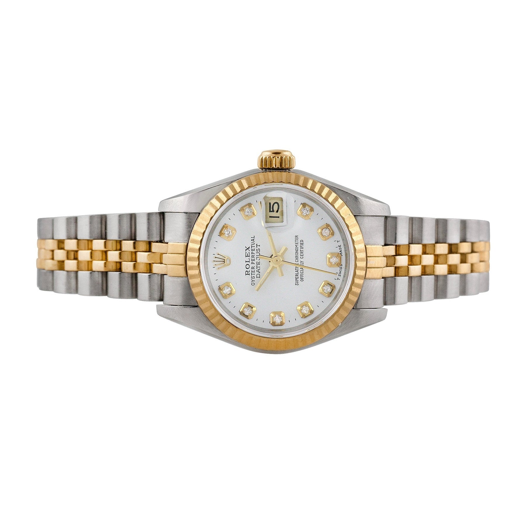 Stainless Steel case with a Stainless Steel and 18K Yellow Gold Jubilee bracelet and 18K Yellow Gold Fluted bezel. White (Refinished) dial with Custom Diamond markers. Automatic movement. Aftermarket Sapphire crystal. Screw down crown. Case size: 26mm. Band width: 13mm, band length: 6.5 inches. Deployment clasp. Water resistant at 100m. Every Rolex watch comes packaged in a generic luxury box. Every Rolex Timepiece come with a 1-year limited warranty from the merchant and a Third-Party Certificate of ity.  Ruumur is an independent company. We are not an authorized dealer, nor are we affiliated with Rolex Watch USA. Rolex is a registered trademark of Rolex Watch U.S.A. and Rolex International. All Rolex watches come with all original parts.