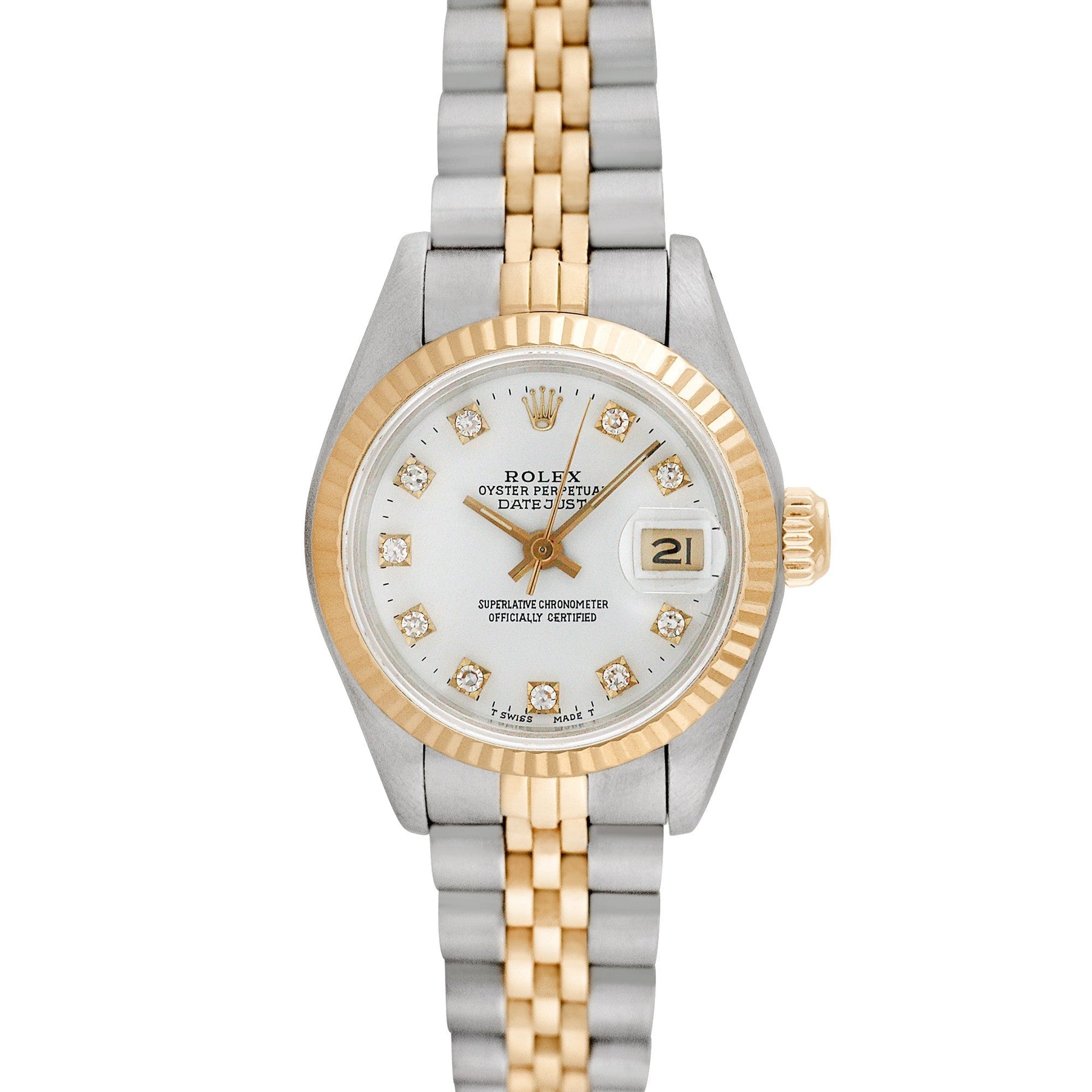 Stainless Steel case with a Stainless Steel and Yellow Gold Jubilee bracelet and Yellow Gold Fluted bezel. White (Refinished) dial with Factory diamonds markers. Automatic movement. Aftermarket Sapphire crystal. Screw down crown. Case size: 26mm. Band width: 13mm, band length: 6.5 inches. Deployment clasp. Water resistant at 100m Every Rolex watch comes packaged in a generic luxury box. Every Rolex Timepiece come with a 1-year limited warranty from the merchant and a Third-Party Certificate of ity.  Ruumur is an independent company. We are not an authorized dealer, nor are we affiliated with Rolex Watch USA. Rolex is a registered trademark of Rolex Watch U.S.A. and Rolex International. All Rolex watches come with all original parts.