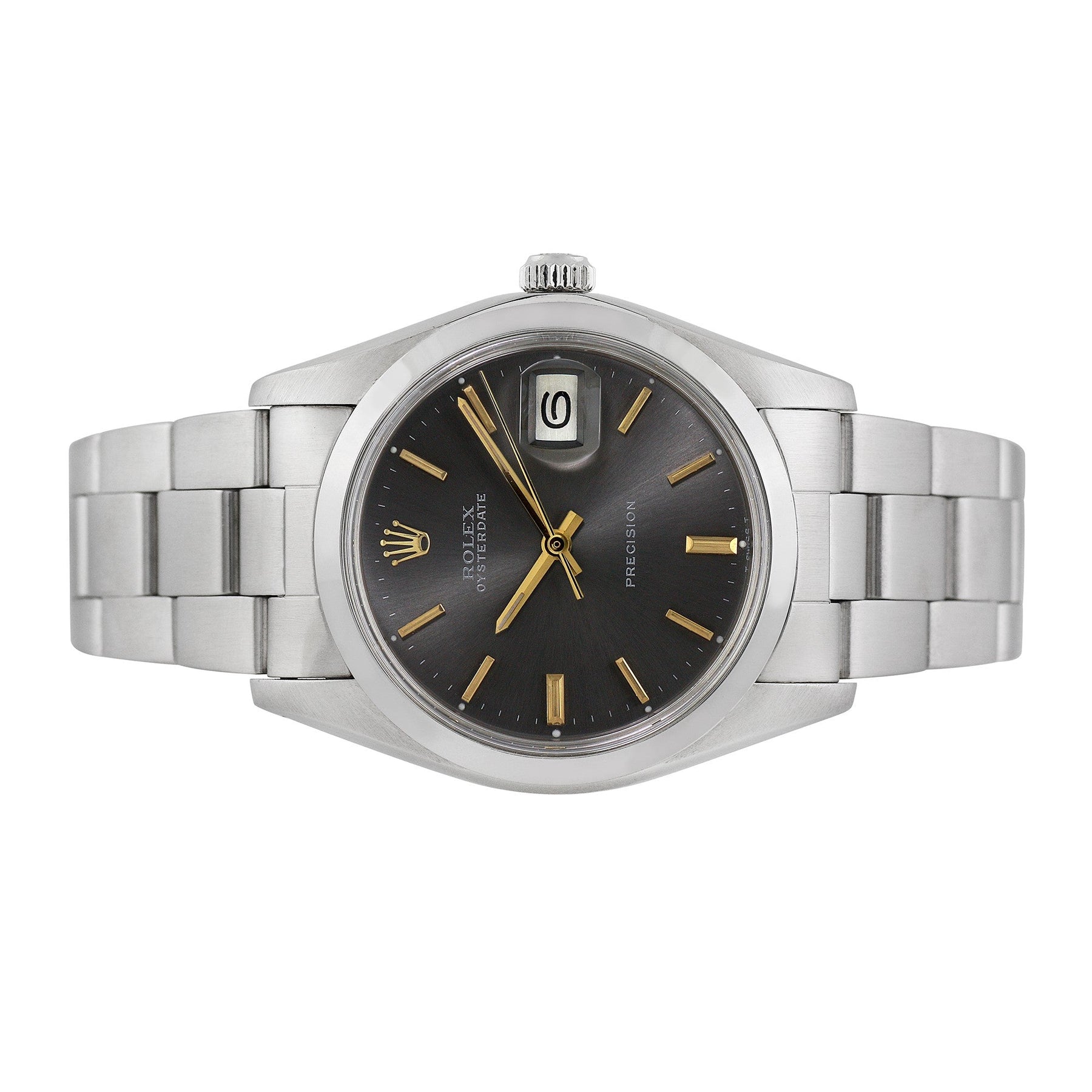 Stainless Steel case with a Stainless Steel Oyster bracelet and Stainless Steel Smooth bezel. Slate (Refinished) dial with Stick markers. Manual wind movement. Aftermarket Acrylic crystal. Screw down crown. Case size: 34mm. Band width: 19mm, band length: 7.5 inches. Deployment clasp. Water resistant at 30m Every Rolex watch comes packaged in a generic luxury box. Every Rolex Timepiece come with a 1-year limited warranty from the merchant and a Third-Party Certificate of ity.  Ruumur is an independent company. We are not an authorized dealer, nor are we affiliated with Rolex Watch USA. Rolex is a registered trademark of Rolex Watch U.S.A. and Rolex International. All Rolex watches come with all original parts.