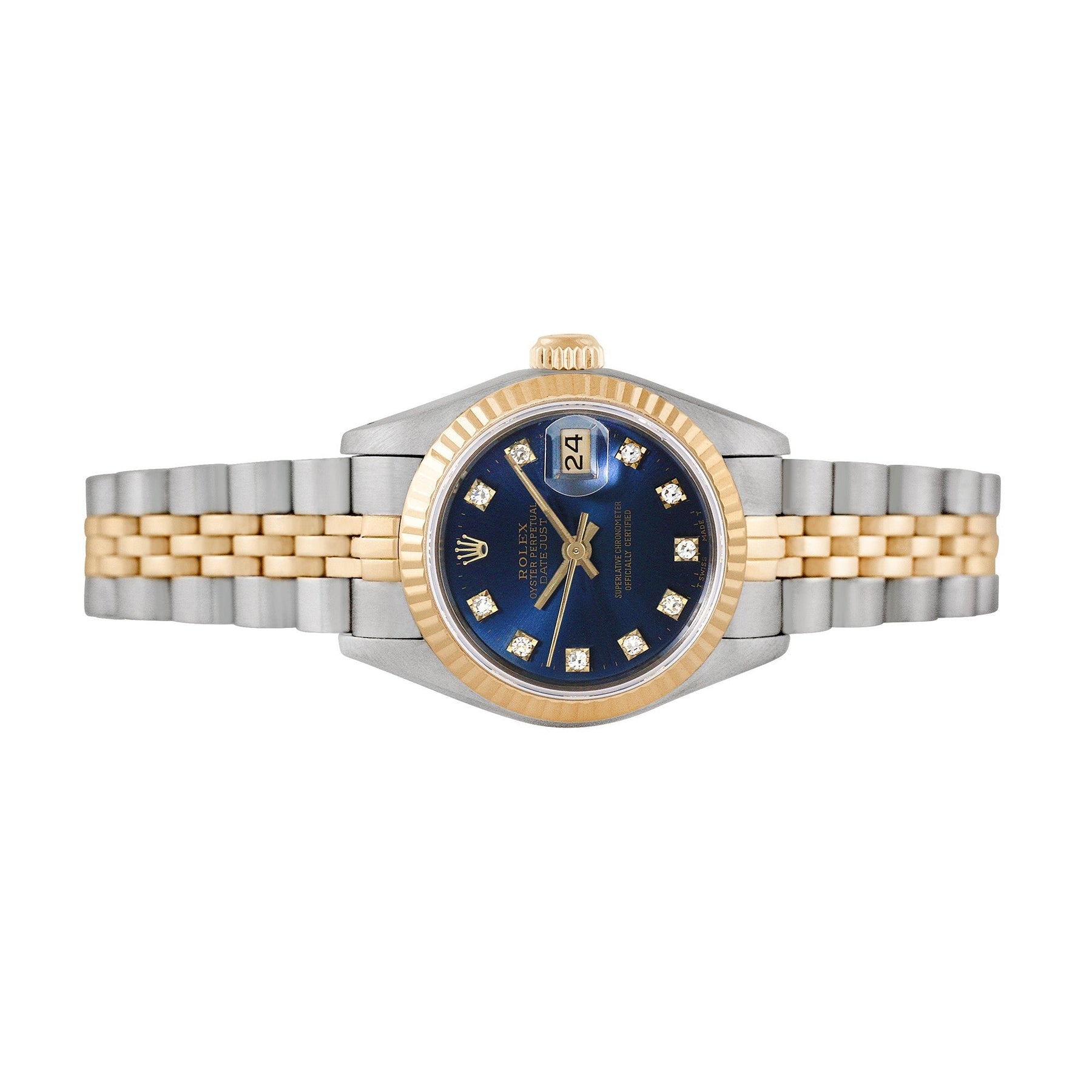 Stainless Steel case with a Stainless Steel and Yellow Gold Jubilee bracelet and Yellow Gold Fluted bezel. Blue (Refinished) dial with Factory diamonds markers. Automatic movement. Aftermarket Sapphire crystal. Screw down crown. Case size: 26mm. Band width: 13mm, band length: 6.5 inches. Deployment clasp. Water resistant at 100m Every Rolex watch comes packaged in a generic luxury box. Every Rolex Timepiece come with a 1-year limited warranty from the merchant and a Third-Party Certificate of ity.  Ruumur is an independent company. We are not an authorized dealer, nor are we affiliated with Rolex Watch USA. Rolex is a registered trademark of Rolex Watch U.S.A. and Rolex International. All Rolex watches come with all original parts.