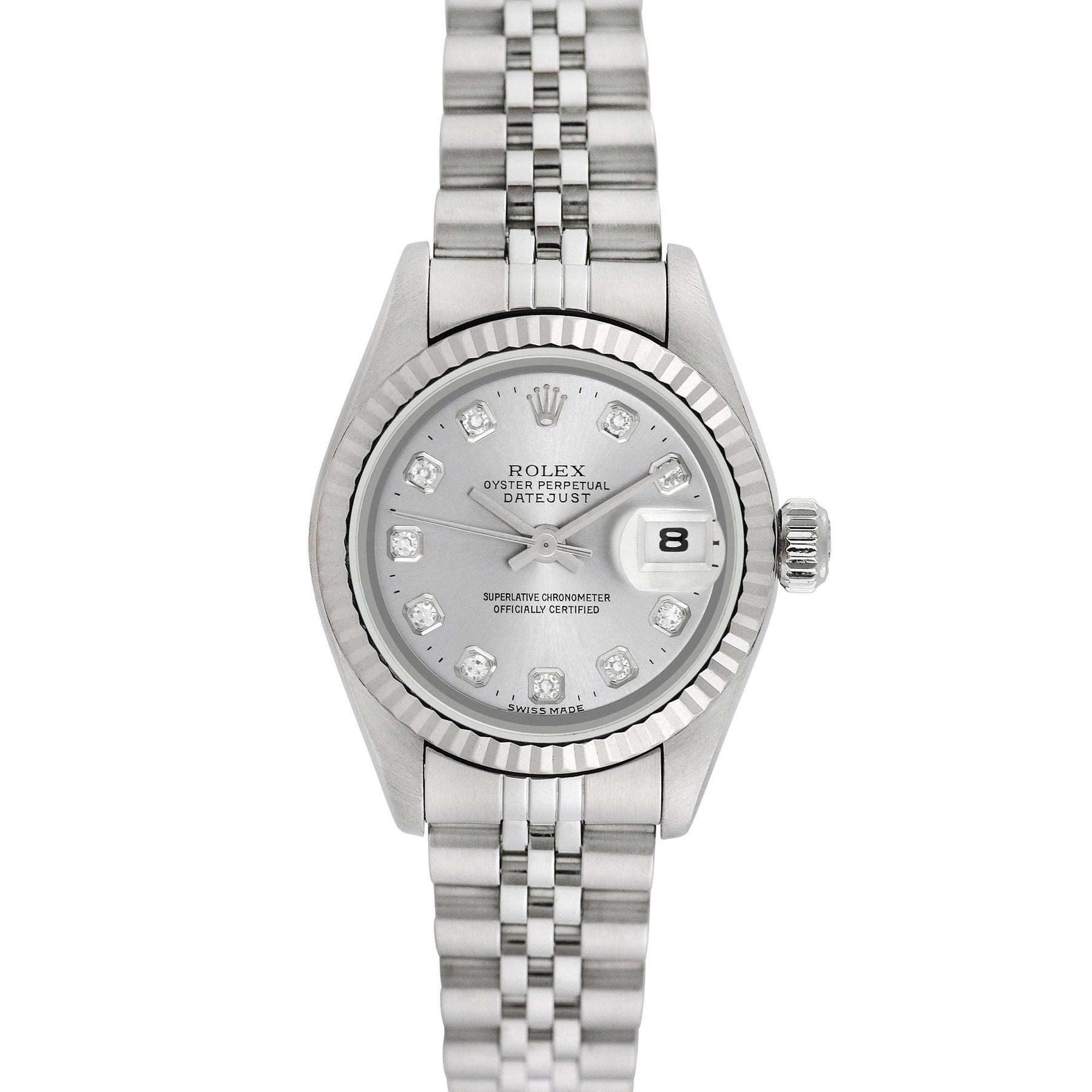 Stainless Steel case with a Stainless Steel Jubilee bracelet and 18K White Gold Fluted bezel. Silver dial with Factory diamonds markers. Automatic movement. Aftermarket Sapphire crystal. Screw down crown. Case size: 26mm. Band width: 13mm, band length: 6.5 inches. Deployment clasp. Water resistant at 100m Every Rolex watch comes packaged in a generic luxury box. Every Rolex Timepiece come with a 1-year limited warranty from the merchant and a Third-Party Certificate of ity.  Ruumur is an independent company. We are not an authorized dealer, nor are we affiliated with Rolex Watch USA. Rolex is a registered trademark of Rolex Watch U.S.A. and Rolex International. All Rolex watches come with all original parts.