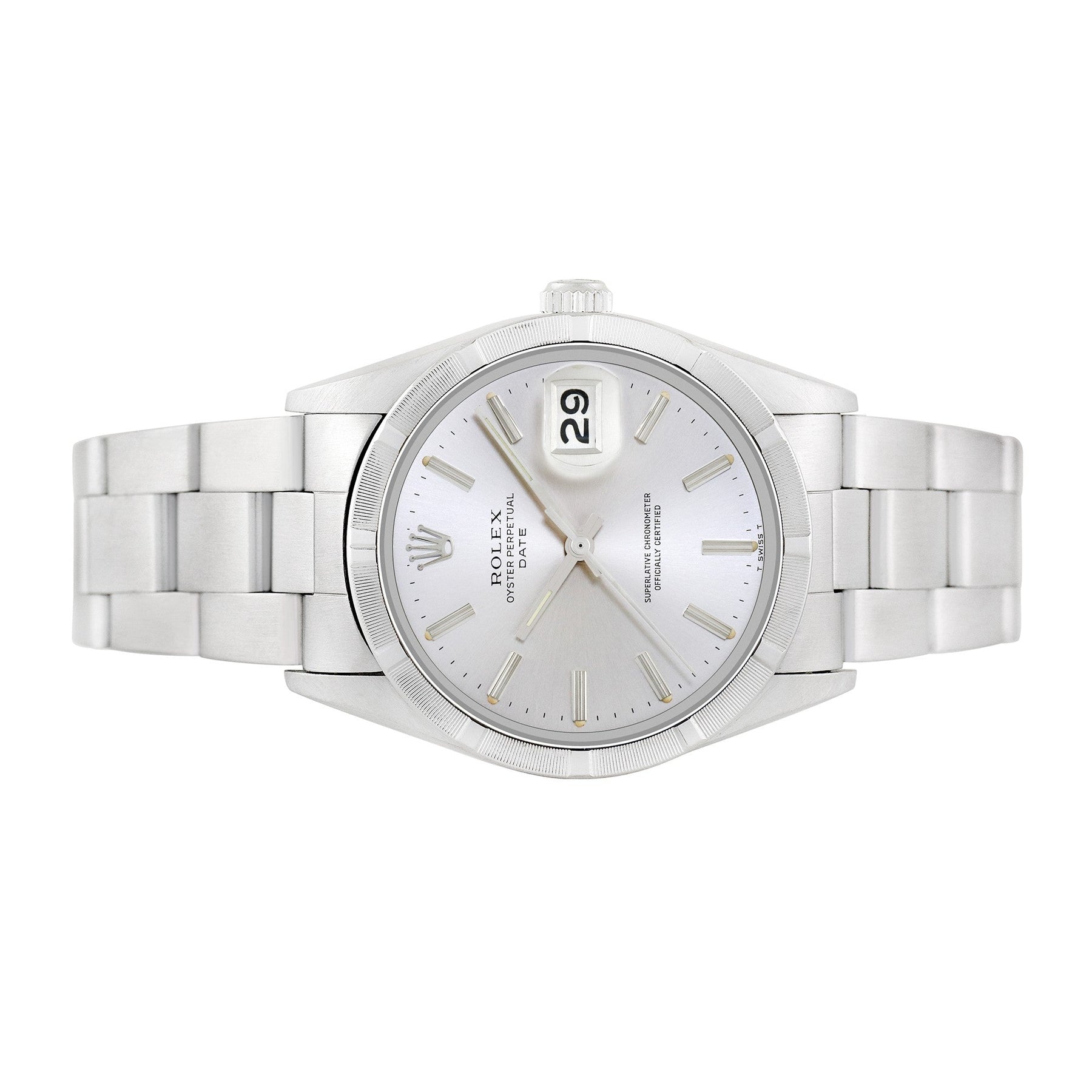 Stainless Steel case with a Stainless Steel Oyster bracelet and Stainless Steel Engine-turned bezel. Silver dial with Stick markers. Automatic movement. Aftermarket Acrylic crystal. Screw down crown. Case size: 34mm. Band width: 18mm, band length: 7.5 inches. Deployment clasp. Water resistant at 100m Every Rolex watch comes packaged in a generic luxury box. Every Rolex Timepiece come with a 1-year limited warranty from the merchant and a Third-Party Certificate of ity.  Ruumur is an independent company. We are not an authorized dealer, nor are we affiliated with Rolex Watch USA. Rolex is a registered trademark of Rolex Watch U.S.A. and Rolex International. All Rolex watches come with all original parts.