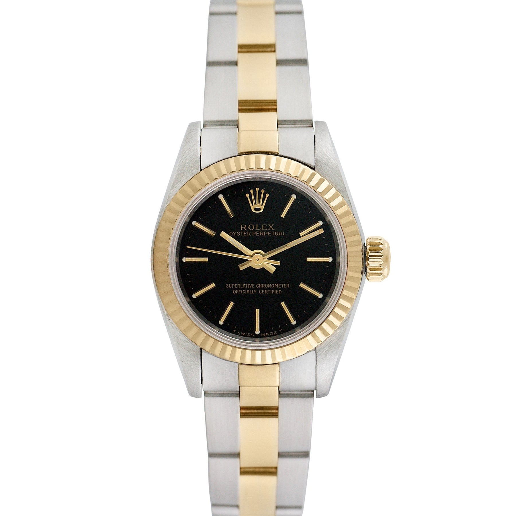 Stainless Steel case with a Stainless Steel and 18K Yellow Gold Oyster bracelet and 18K Yellow Gold Fluted bezel. Black dial with Stick markers. Automatic movement. Aftermarket Sapphire crystal. Screw down crown. Case size: 25mm. Band width: 13mm, band length: 6.5 inches. Deployment clasp. Water resistant at 100m Every Rolex watch comes packaged in a generic luxury box. Every Rolex Timepiece come with a 1-year limited warranty from the merchant and a Third-Party Certificate of ity.  Ruumur is an independent company. We are not an authorized dealer, nor are we affiliated with Rolex Watch USA. Rolex is a registered trademark of Rolex Watch U.S.A. and Rolex International. All Rolex watches come with all original parts.