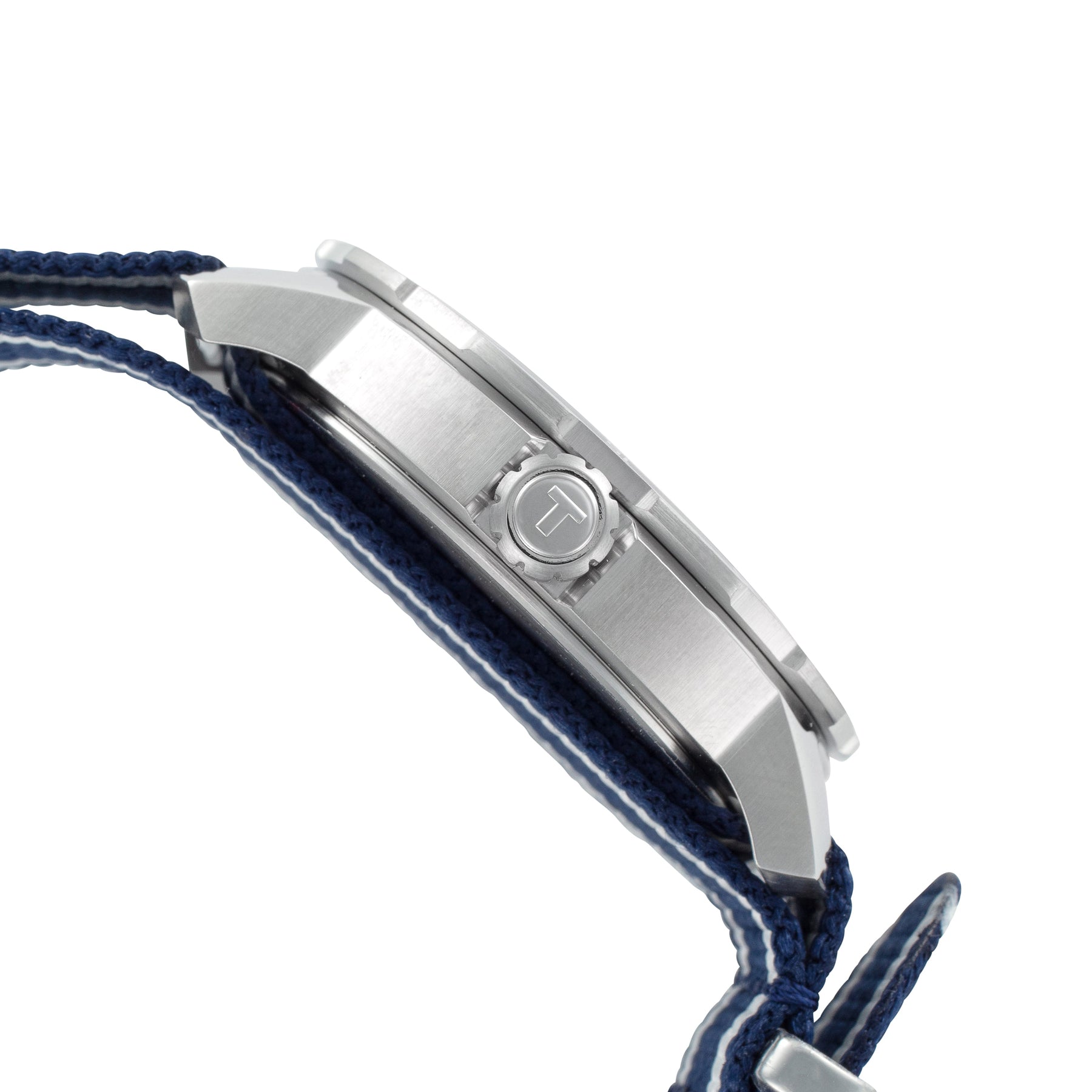Case Material: Stainless Steel - Case Diameter: 40mm - Case Crystal: Sapphire Crystal Scratch Resistant - Water Resistance: 100 m (330 feet) - Dial Color: Silver - Band: Blue Fabric Strap - Movement: Quartz - Made in Switzerland