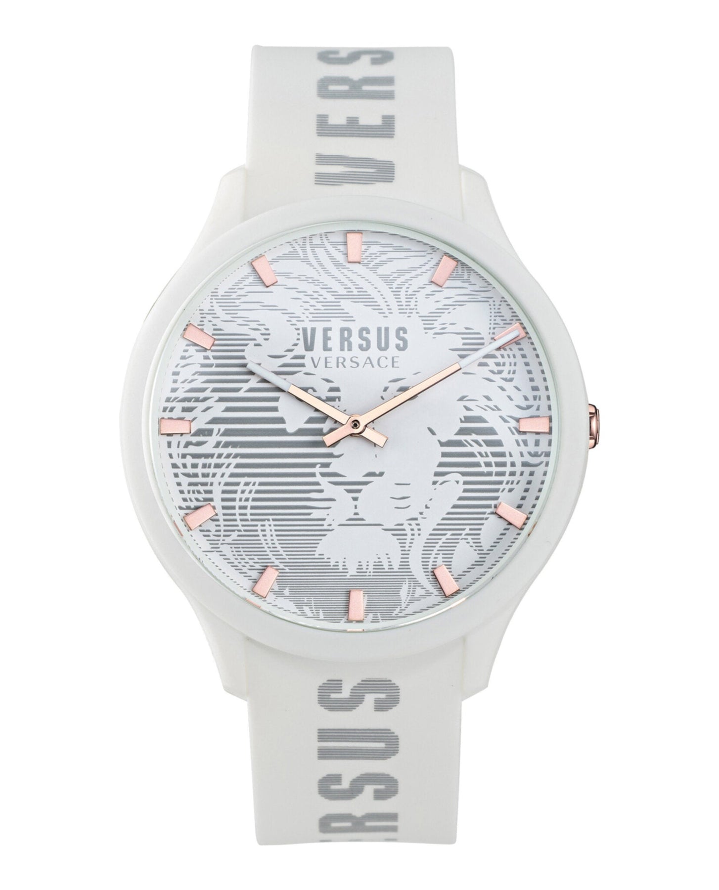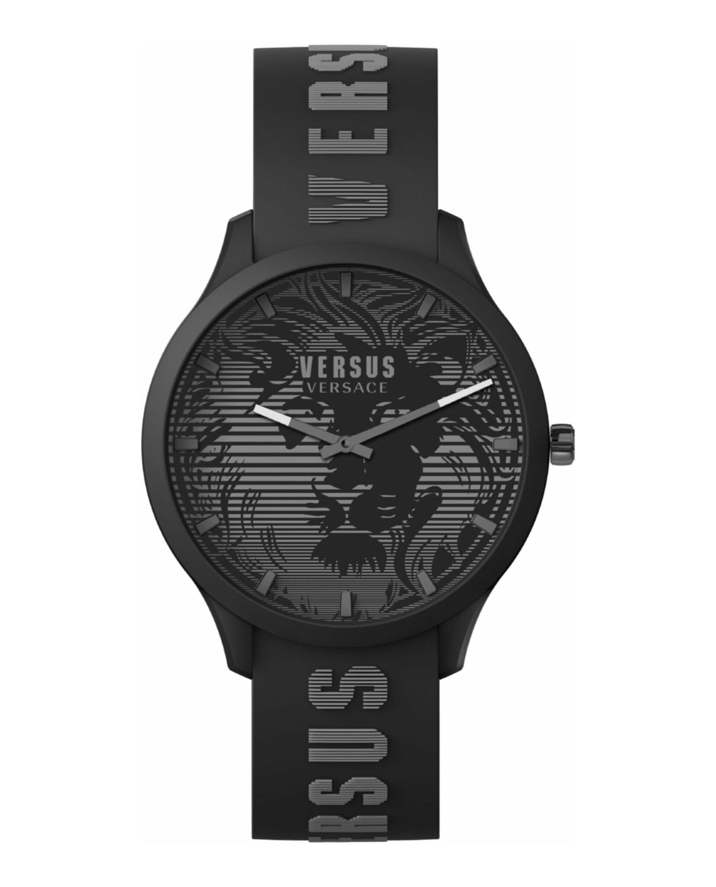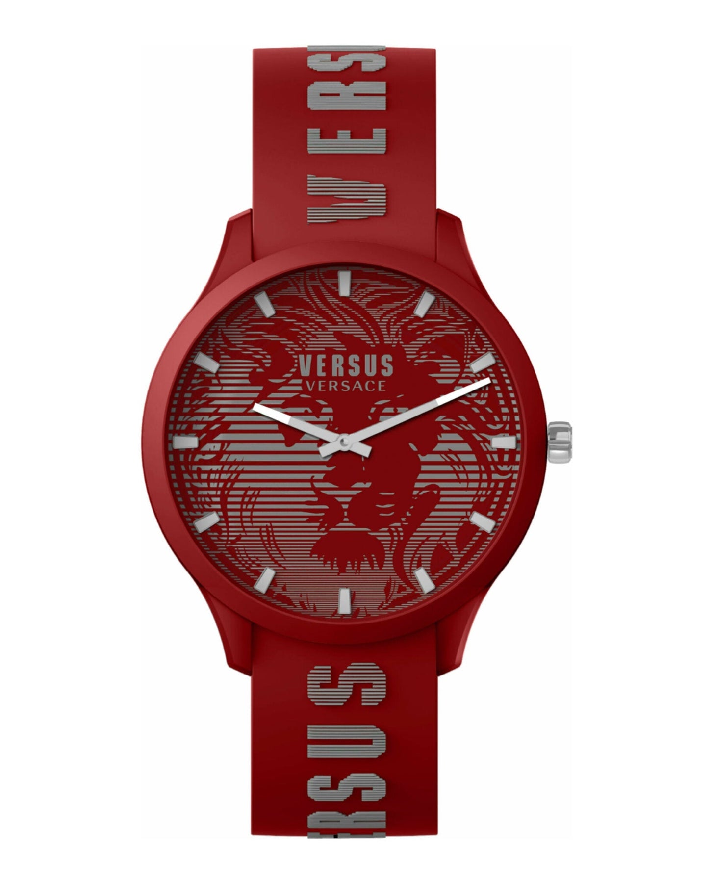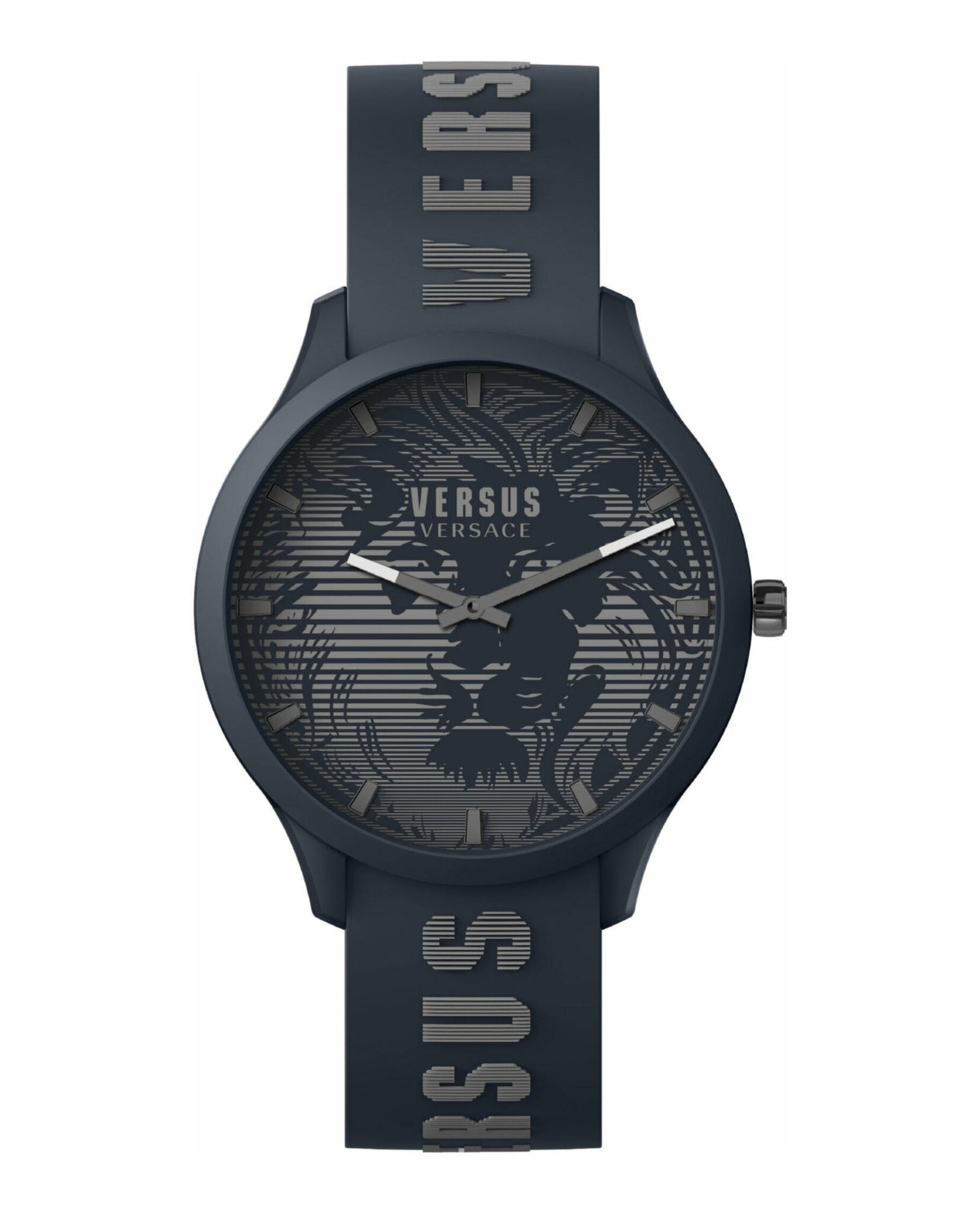 Versus Domus gets cooler for the summer season with a 44mm polycarbonate case a new decoration and a trendy silicone strap. A series of lines creates the lion head on dial and the same technique is used for the Versus lettering on the silicone strap. Every model comes with a matching pouch.