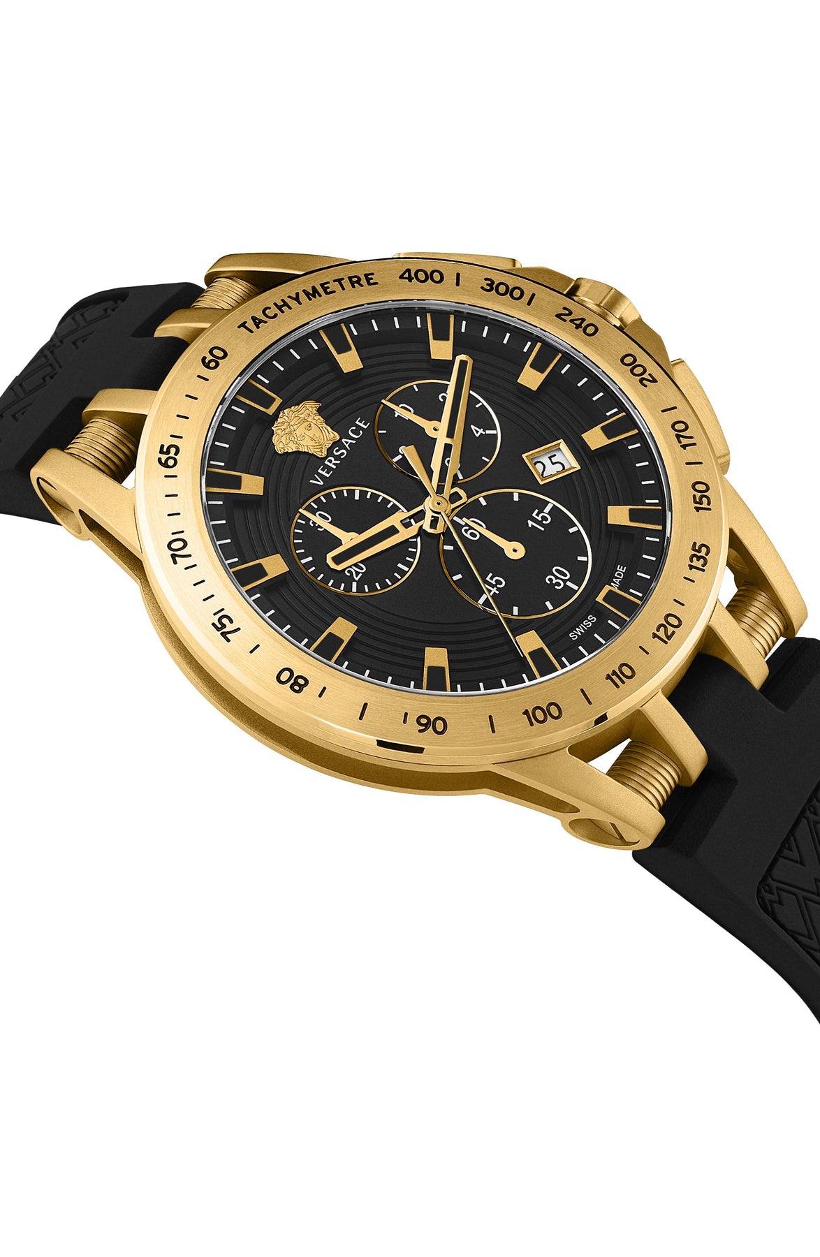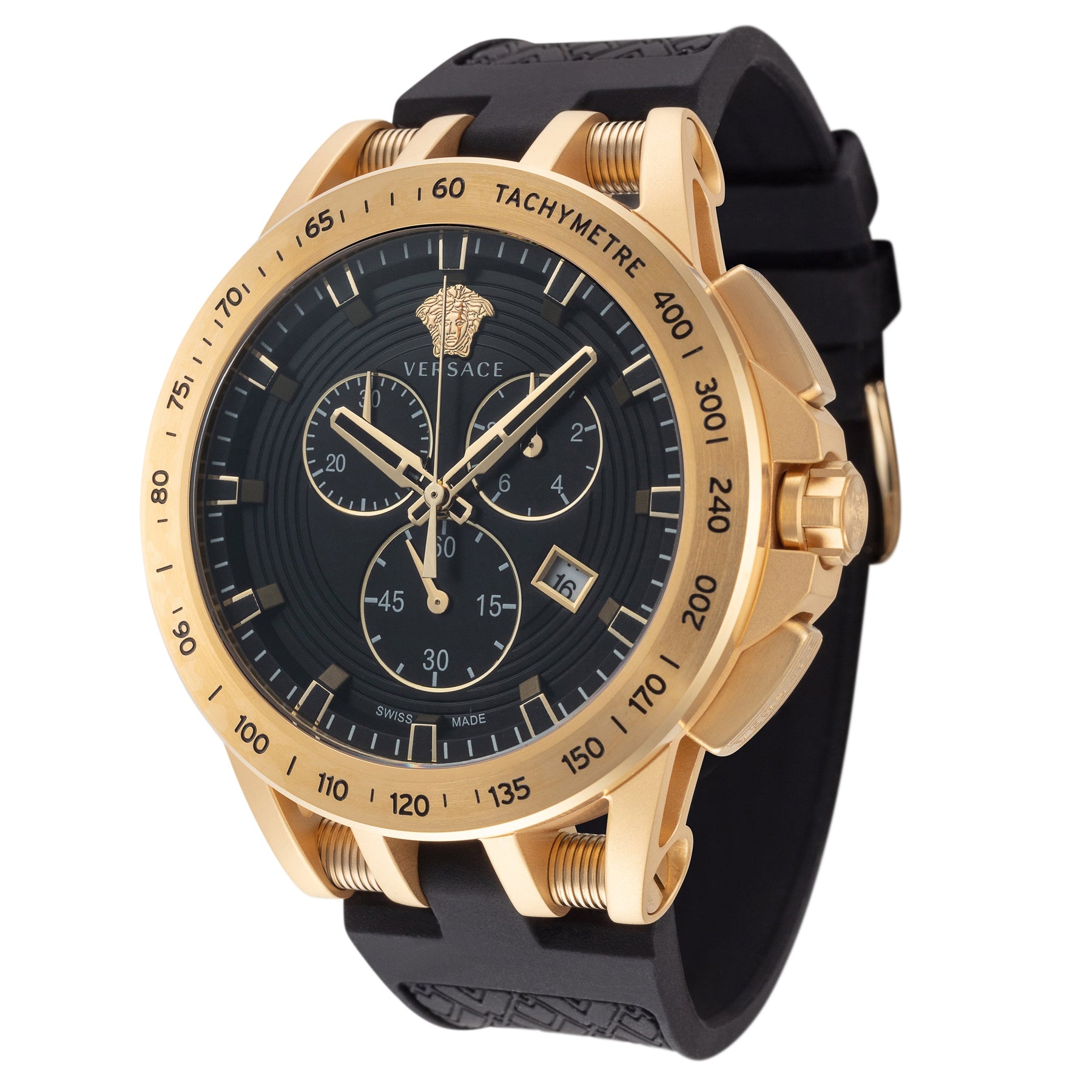 Case Material: Stainless Steel - Case Diameter: 45mm - Case Crystal: Sapphire Crystal Scratch Resistant - Water Resistance: 50 m (165 feet) - Dial Color: Black - Band: Black Silicone Strap - Movement: Quartz - Features: Date - Made in Switzerland