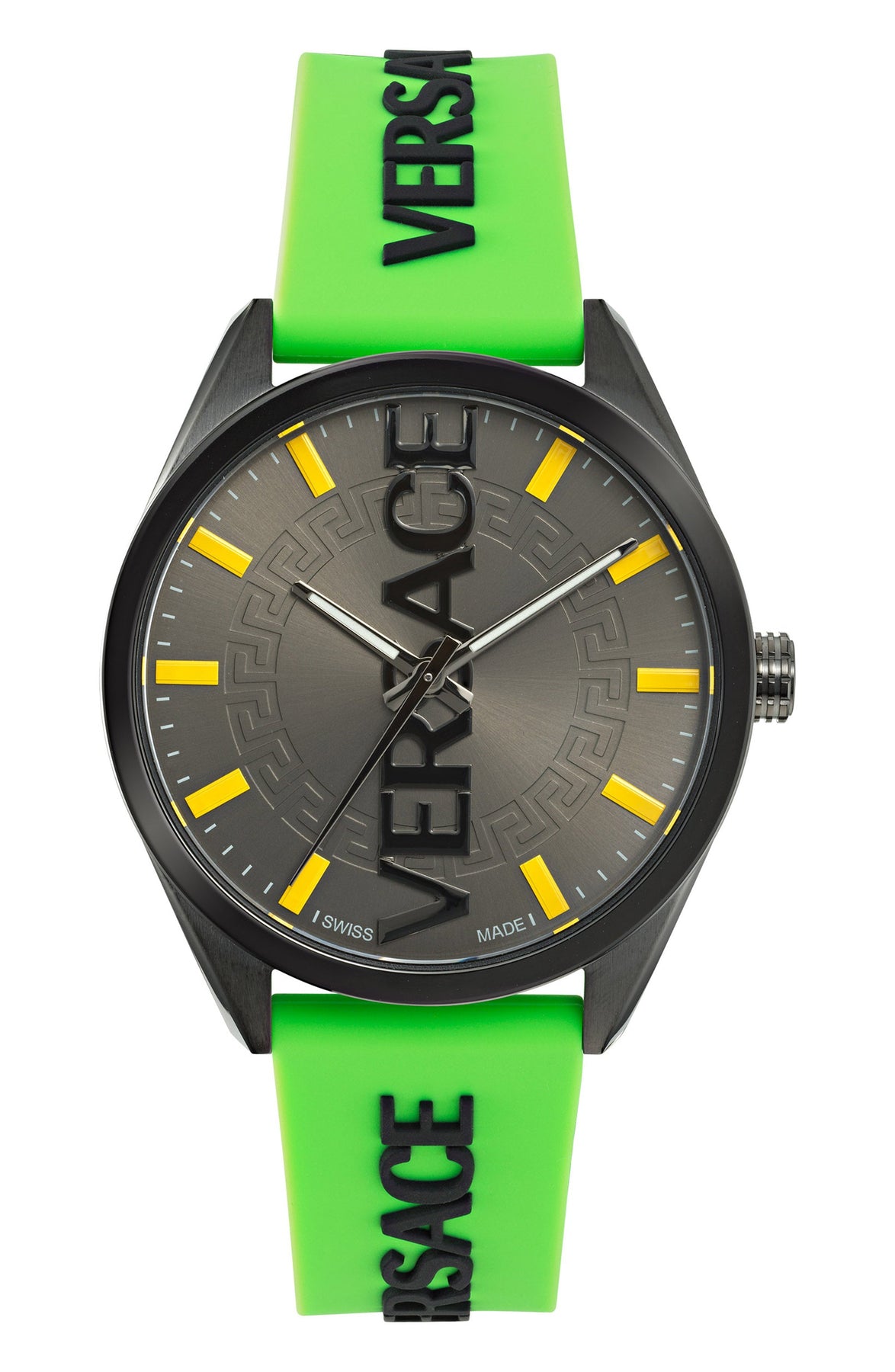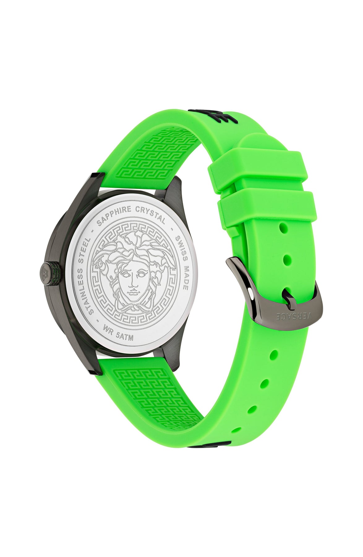 Case Material: Stainless Steel - Case Diameter: 42mm - Case Crystal: Sapphire Crystal Scratch Resistant - Water Resistance: 50 m (165 feet) - Dial Color: Grey - Band: Green Silicone Strap - Movement: Quartz - Made in Switzerland