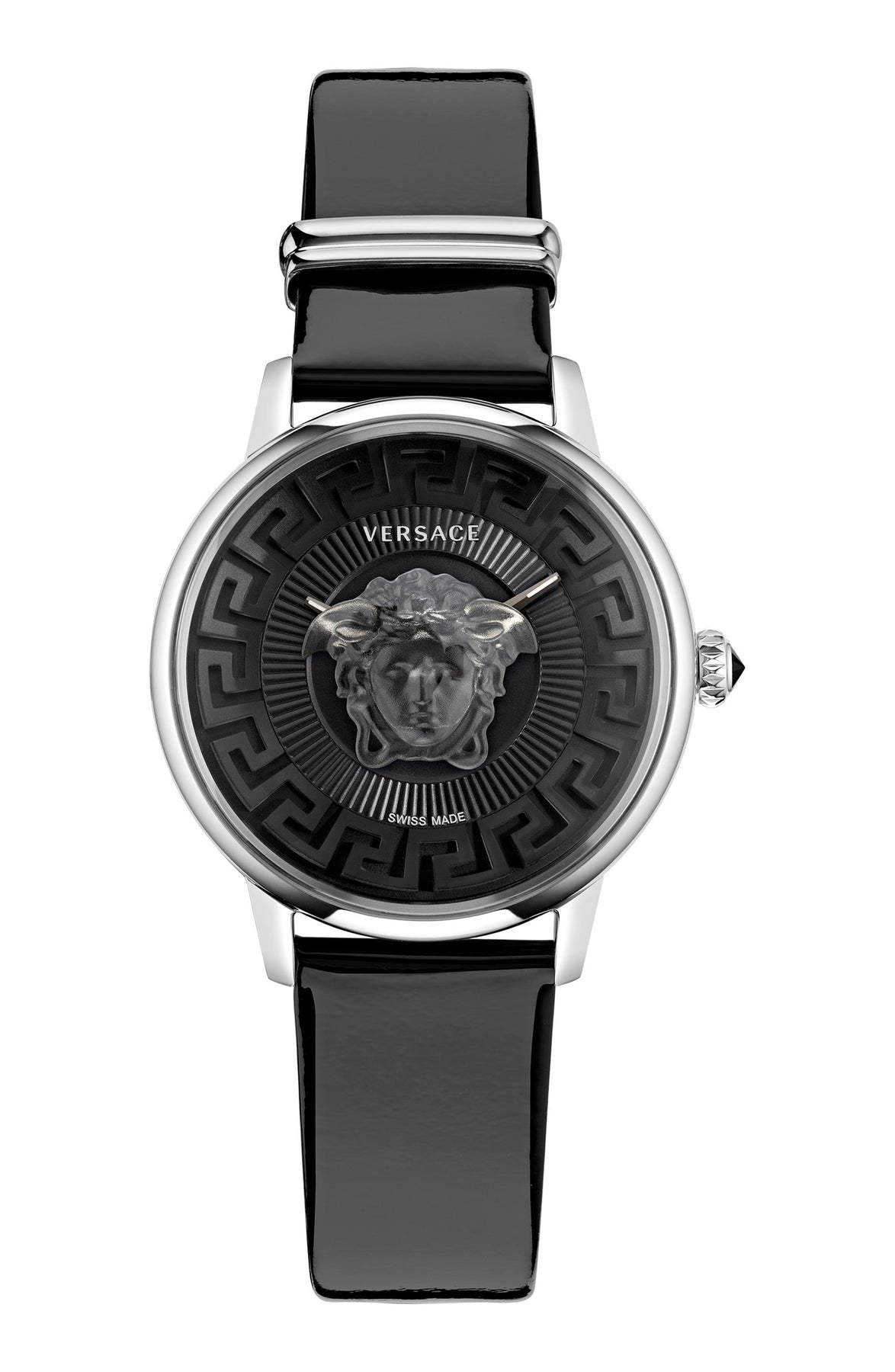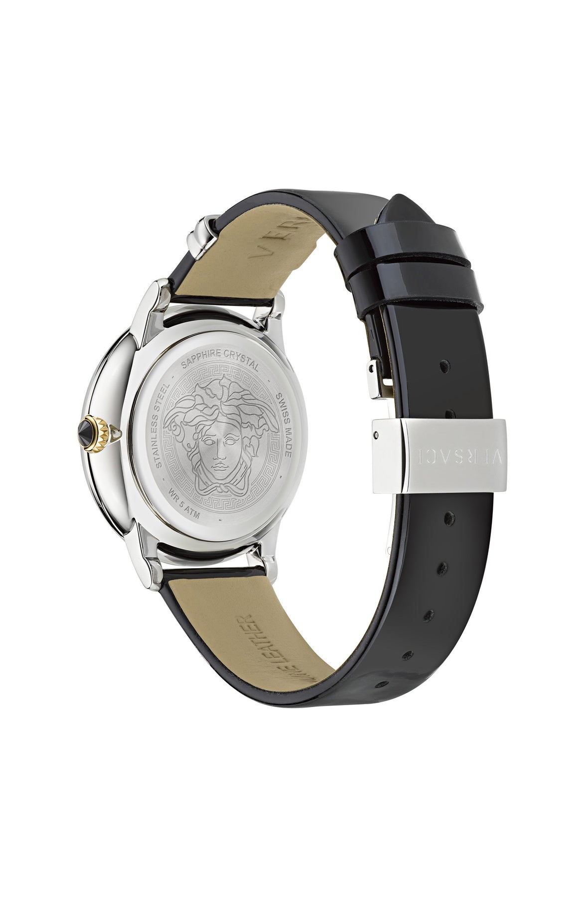 Case Material: Stainless Steel - Case Diameter: 38mm - Case Crystal: Sapphire Crystal Scratch Resistant - Water Resistance: 50 m (165 feet) - Dial Color: Black - Band: Black Leather Calf Skin Strap - Movement: Quartz - Made in Switzerland