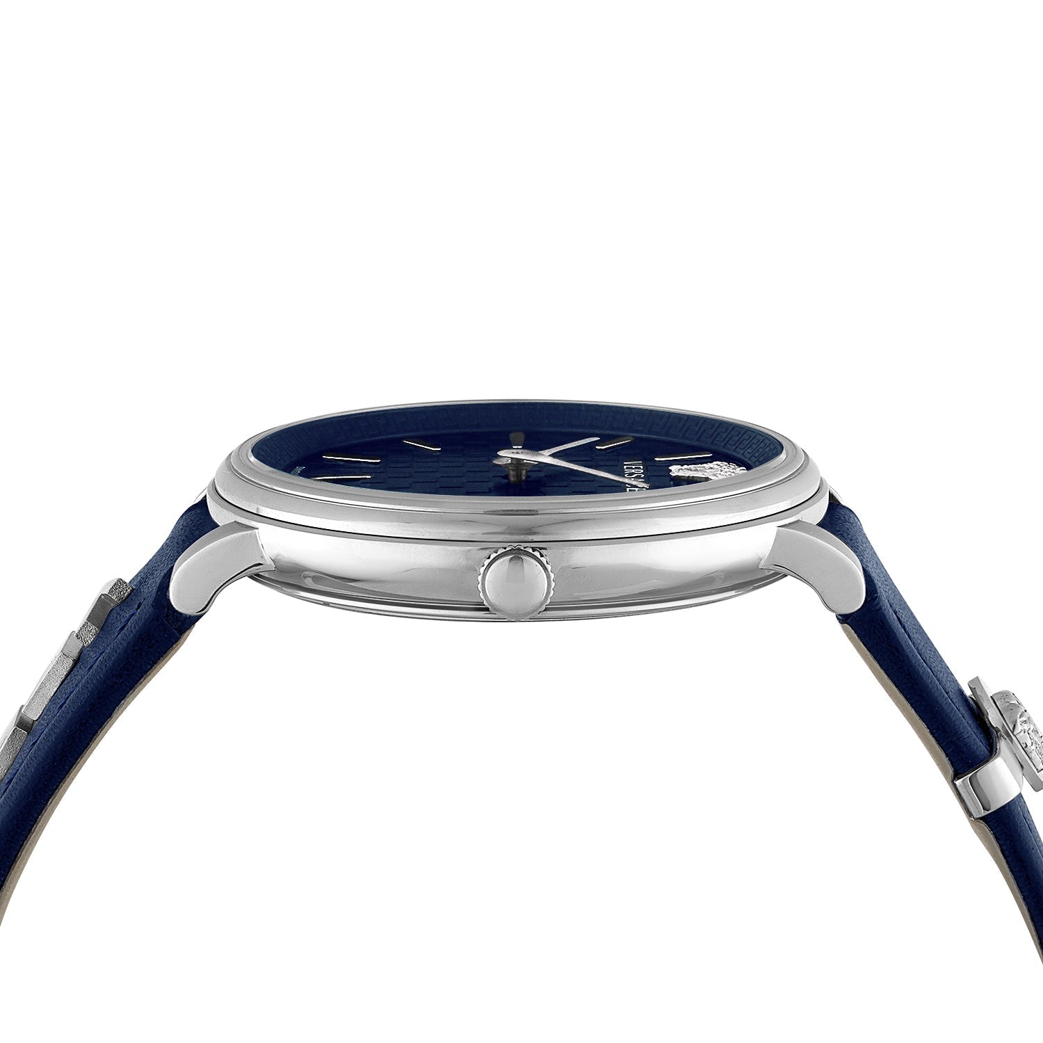 Case Material: Stainless Steel - Case Diameter: 38mm - Case Crystal: Mineral Crystal - Water Resistance: 50 m (165 feet) - Dial Color: Blue - Band: Blue Leather Calf Skin Strap - Movement: Quartz - Features: - Made in Switzerland