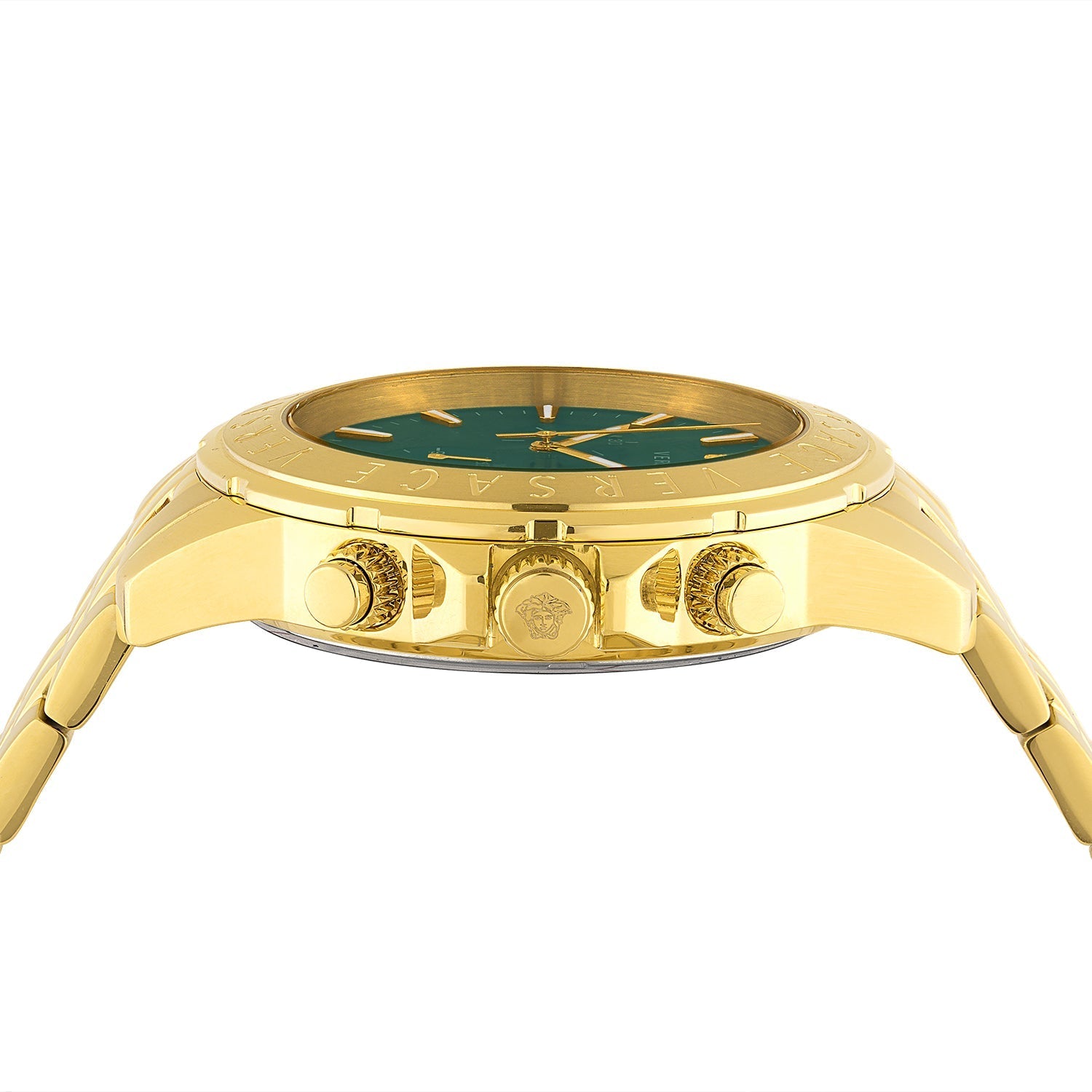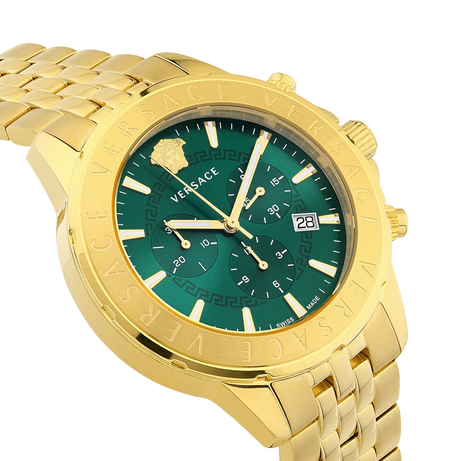 Case Material: Stainless Steel - Case Diameter: 44mm - Case Crystal: Sapphire Crystal Scratch Resistant - Water Resistance: 50 m (165 feet) - Dial Color: Green - Band: Gold Stainless Steel Bracelet - Movement: Quartz - Made in Switzerland