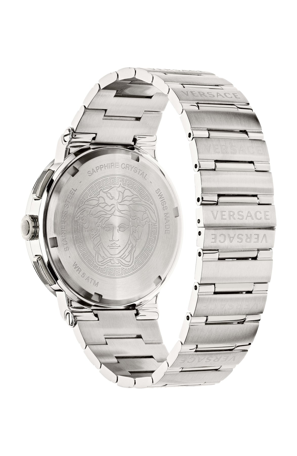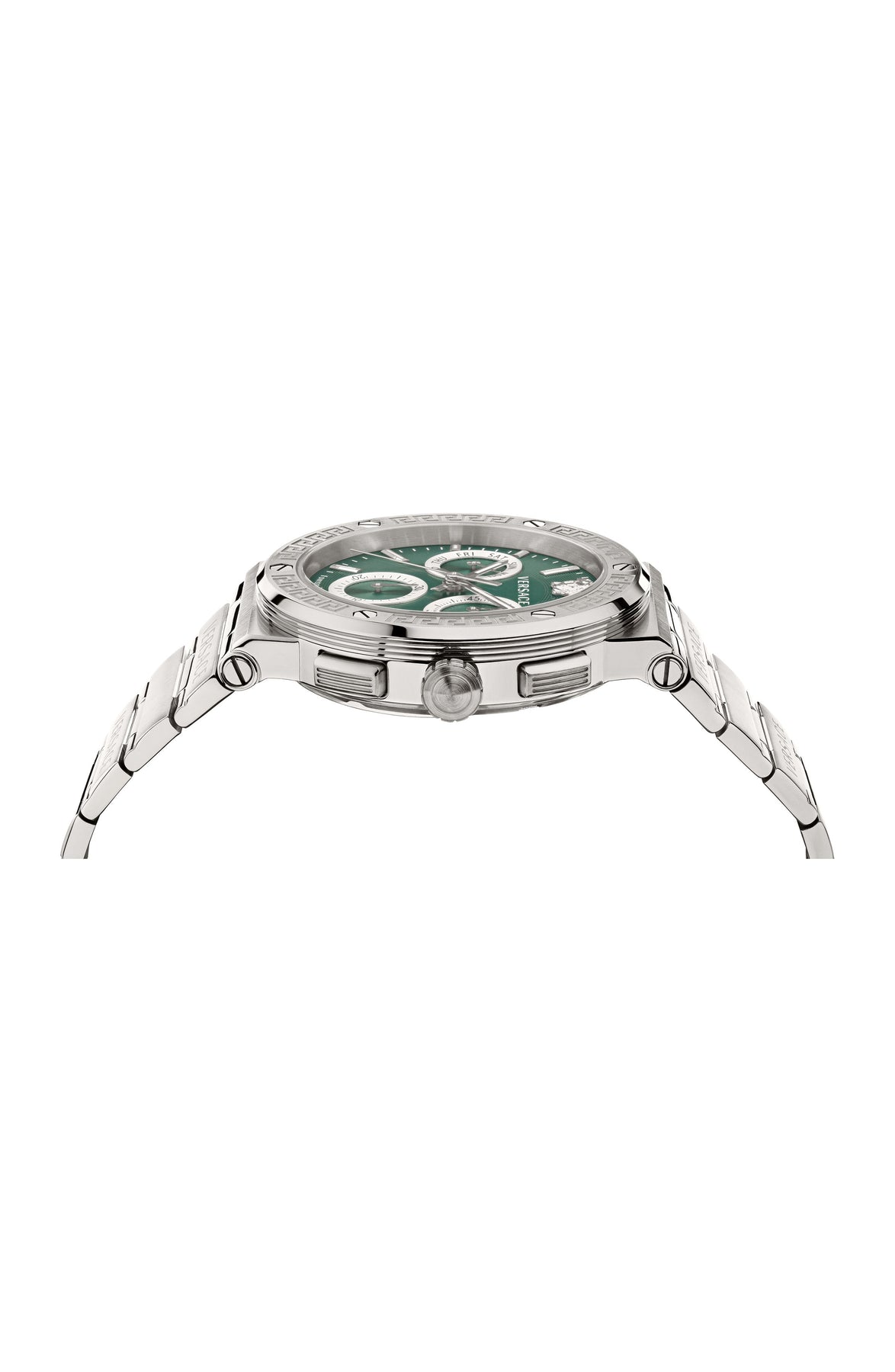 Case Material: Stainless Steel - Case Diameter: 43mm - Case Crystal: Mineral Crystal - Water Resistance: 50 m (165 feet) - Dial Color: Green - Band: Silver Stainless Steel Bracelet - Movement: Quartz - Features: Chronograph - Made in Switzerland