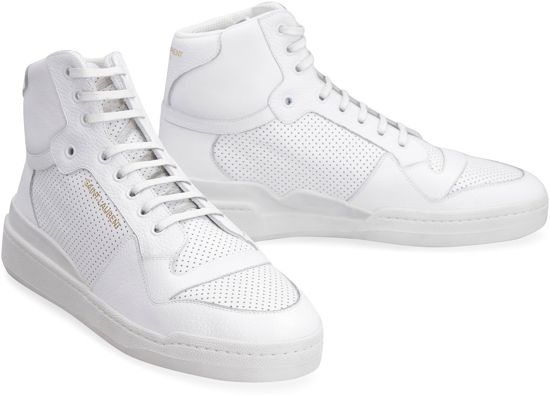 Step up your sneaker game with these luxurious leather sneakers from a renowned designer brand. Crafted from white perforated and grained calfskin with a -out effect, these SL24 sneakers exude effortless style and sophistication. Featuring an embossed Saint Laurent logo on the side, lace-up closure, embossed logo at the back, and a durable rubber sole, these Italian-sized sneakers are the perfect addition to your luxury footwear collection.