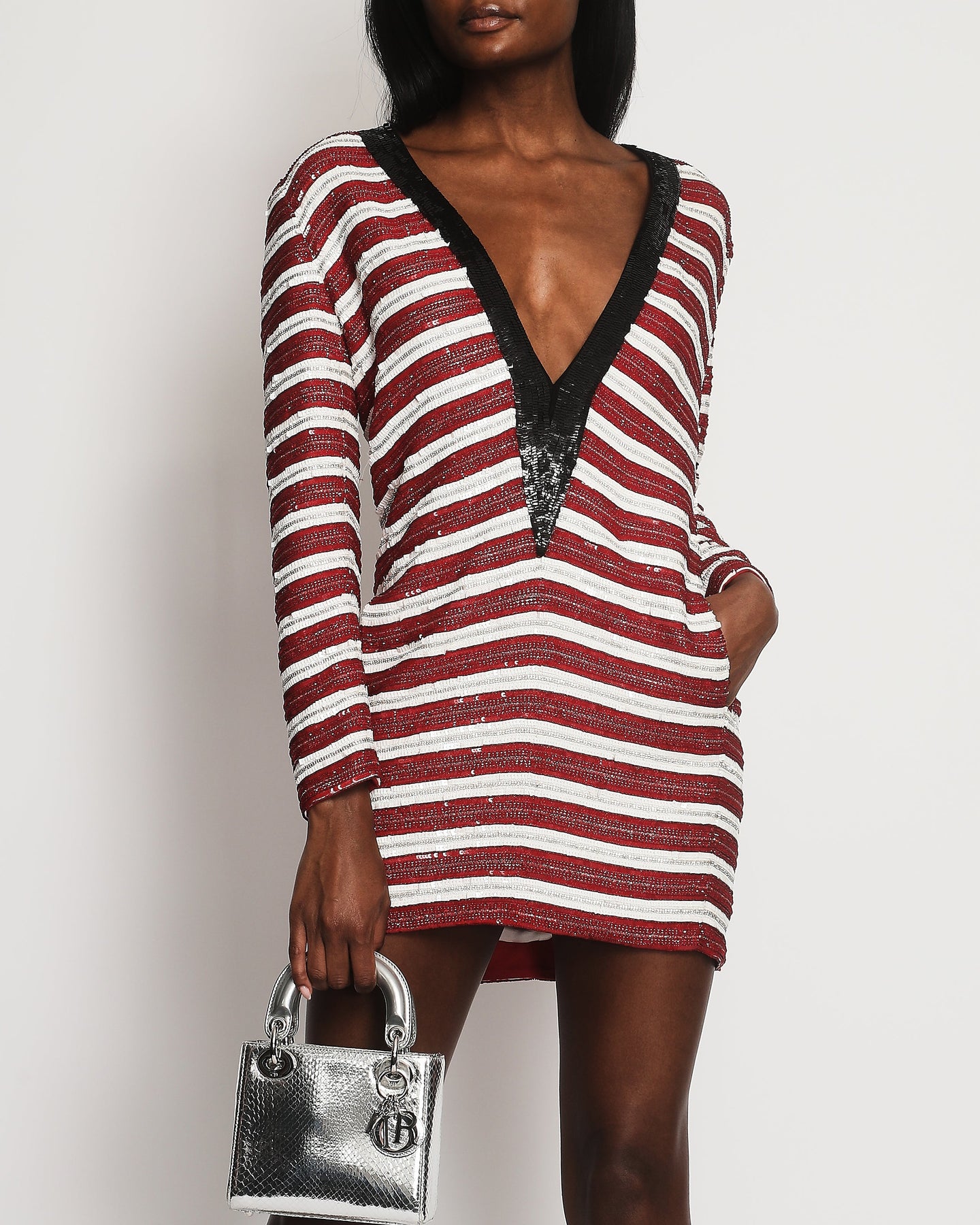 *HOT* Saint Laurent Red, White & Black Sequin Striped Dress with Shoulder Pad Detail Size FR 36 (UK 8)