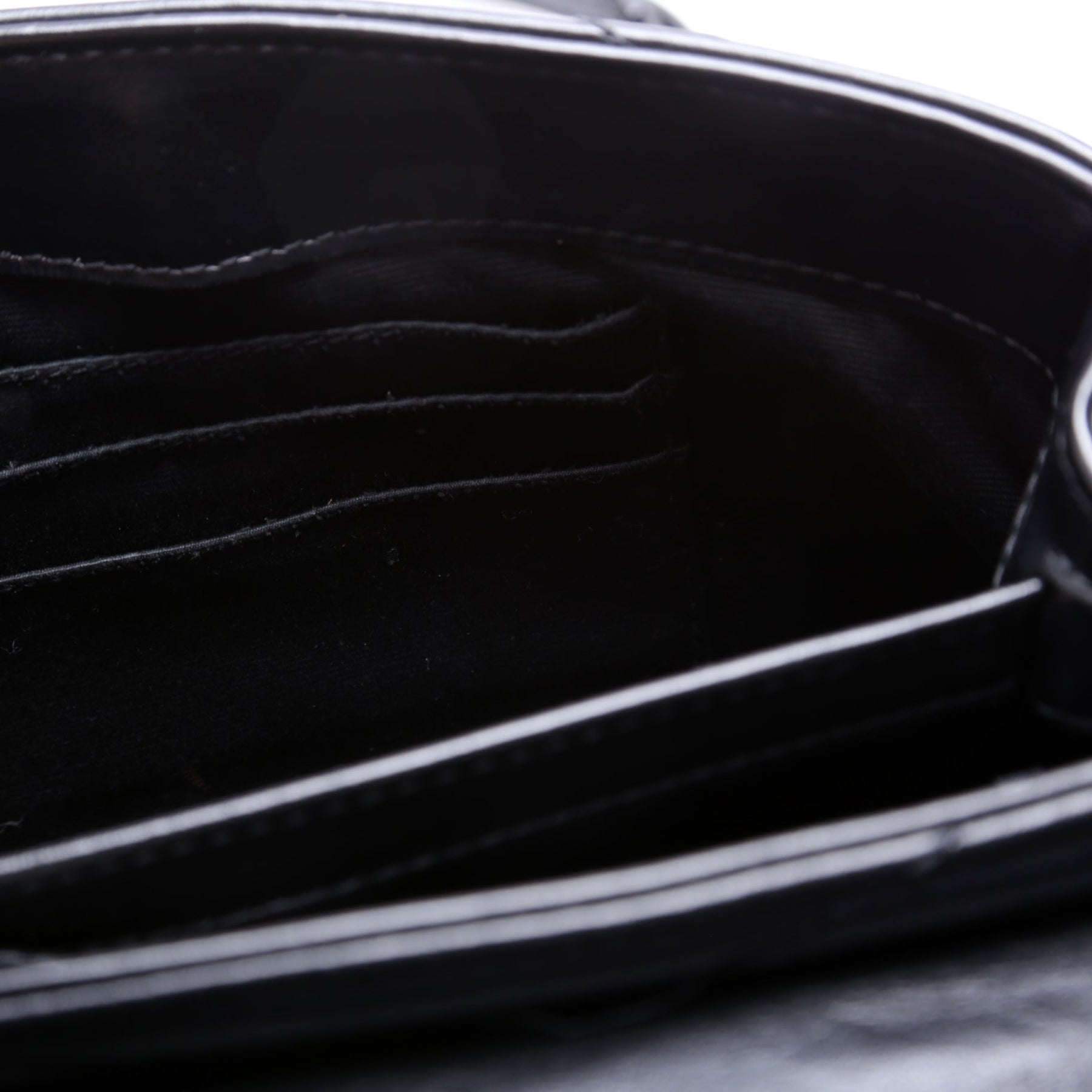 Interior: The interior is clean and free of any major signs of wear. The interior leather and flap show minor marks and scuffs. The interior features two open sections, three card slots, and one zipper pocket.