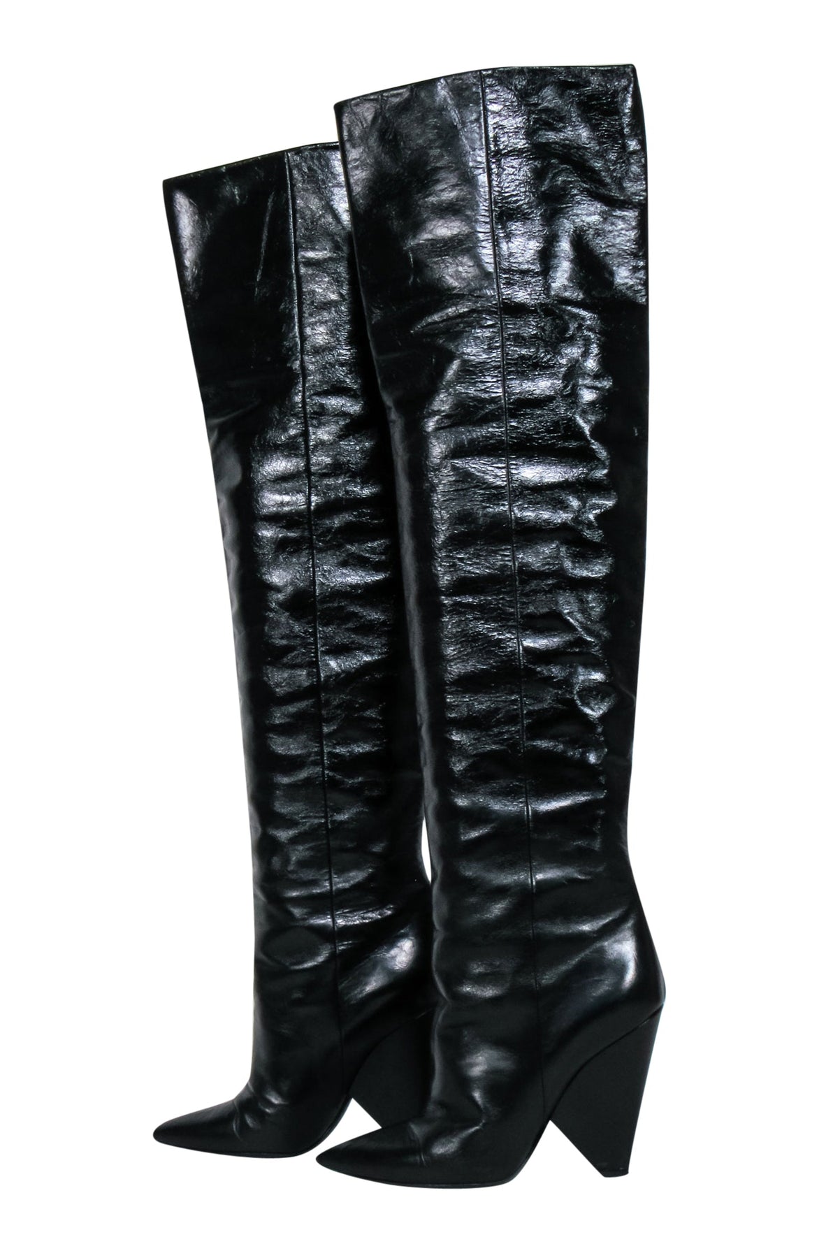 Step out in style with these stunning black over-the-knee boots from Saint Laurent. Crafted from crinkled leather and featuring a sleek wedged heel, these boots are the perfect addition to any fashion-forward wardrobe. Style with a mini LBD for a sultry bombshell look for your next date night.
