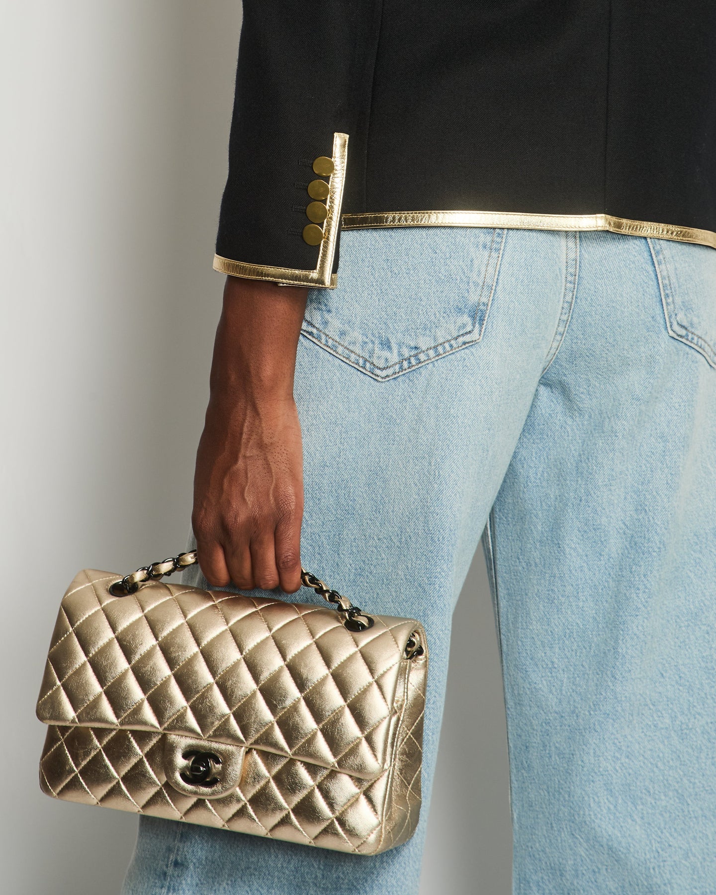 Saint Laurent Black Blazer with Metallic Gold Lapel & Antique Gold Buttons Details Size FR 40 (UK 12)