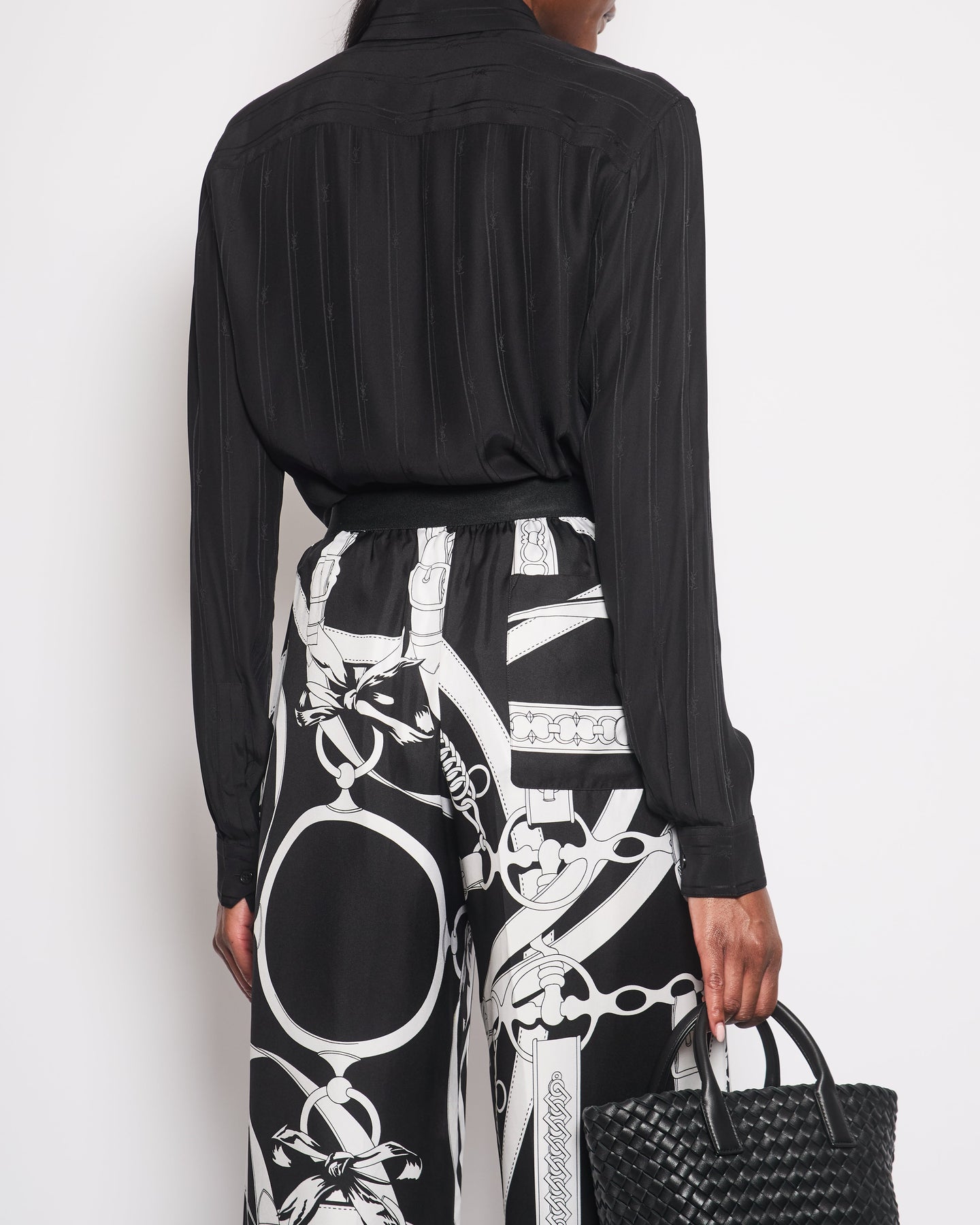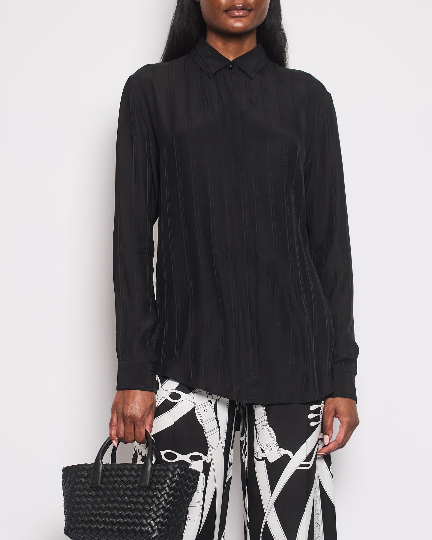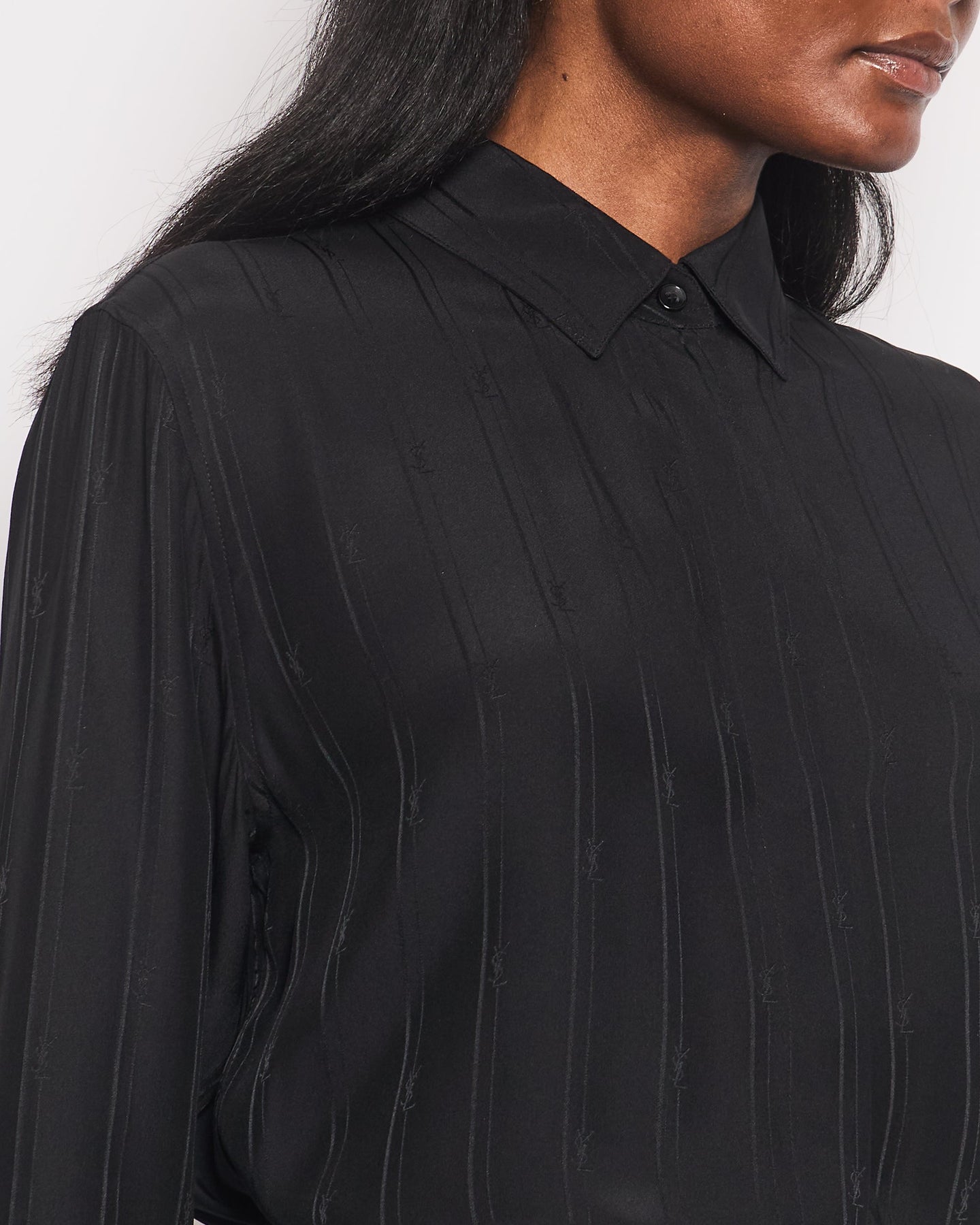 Saint Laurent Black Silk Long-Sleeve Button Down Blouse with Logo Print Size FR 38 (UK 10)