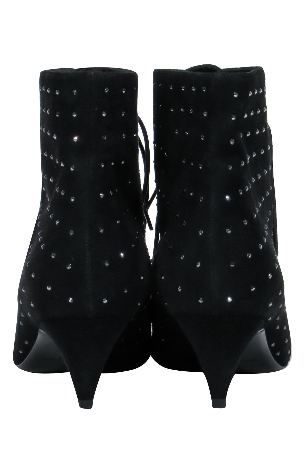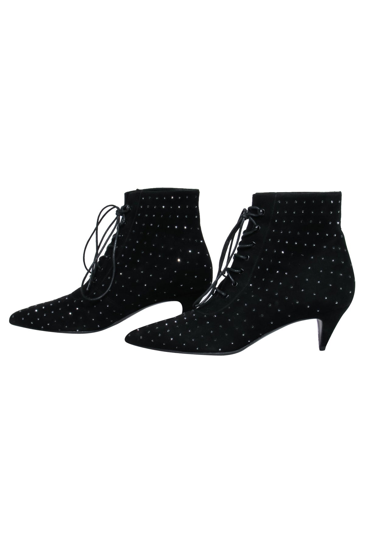 Look chic and glamorous in these glitzy Saint Laurent ankle boots. Featuring a kitten heel, these boots were definitely made for walking. The gleaming crystal embellishing adds a touch of luxe, while the pointed toe and lace-up closure create a sleek and elongated silhouette. Pair with your favorite jeans and blazer for a polished look.