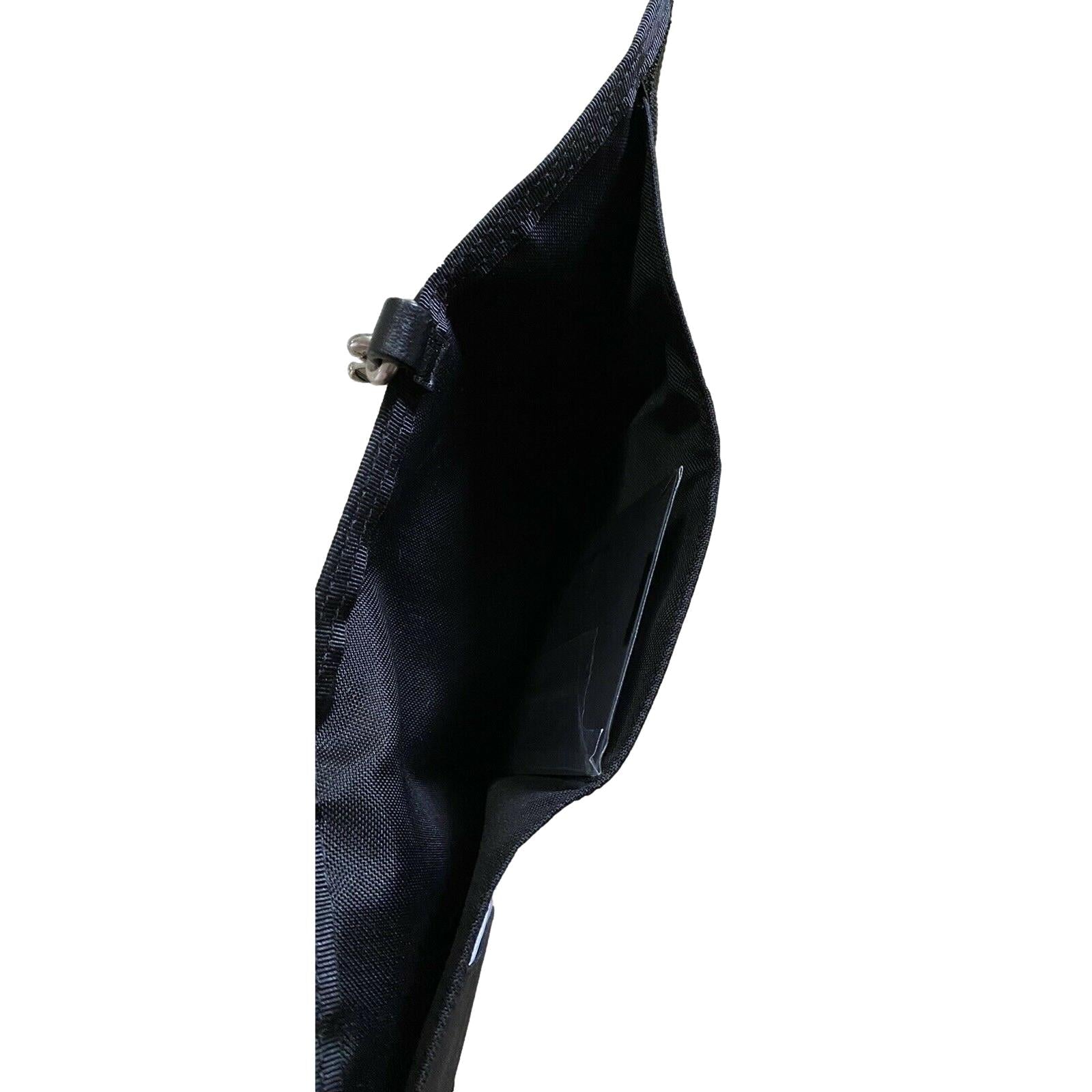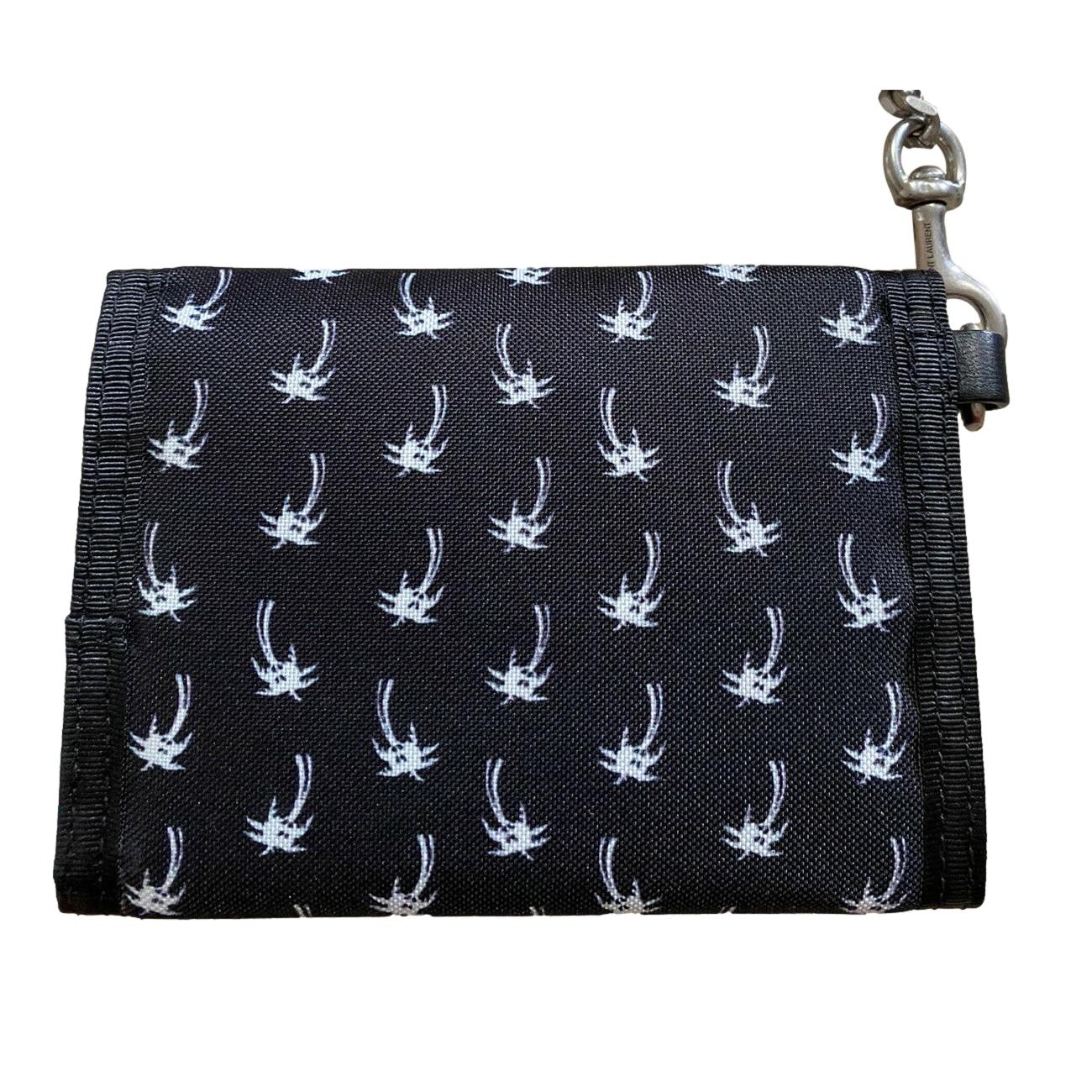 This Saint Laurent trifold chain wallet in black nylon features a white palm print along with silver-tone hardware. The Velcro closure flap opens to five card slots, one zippered coin pocket, and one long bill slot. This slim and sleek trifold is perfect for everyday use, and will hold all of your daily essentials.