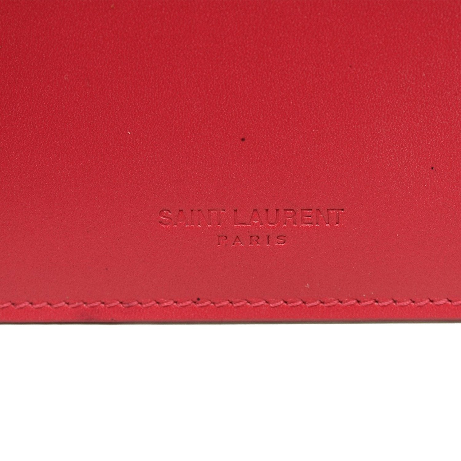 - Exterior: Soft leather in lipstick pink (three document slots). Embossed Saint Laurent Paris stamp; Interior: Soft black leather interior with gold-stamped Saint Laurent Paris.