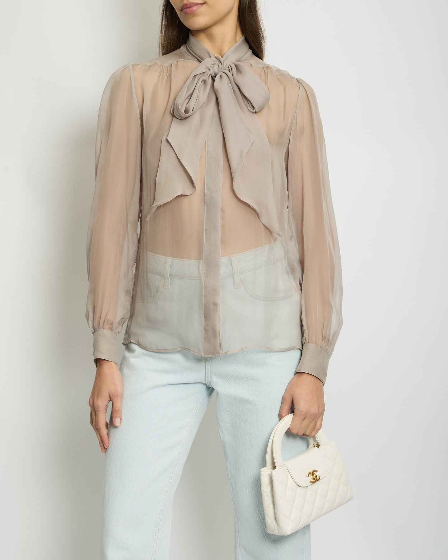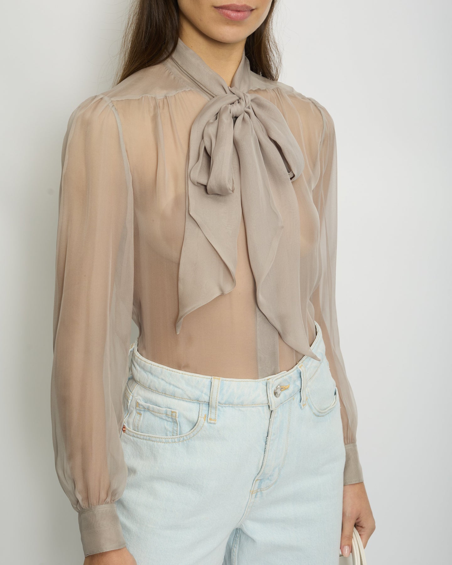 Saint Laurent Dove Grey Silk Button Down Shirt with Neck Tie Detail FR 38 (UK 10)