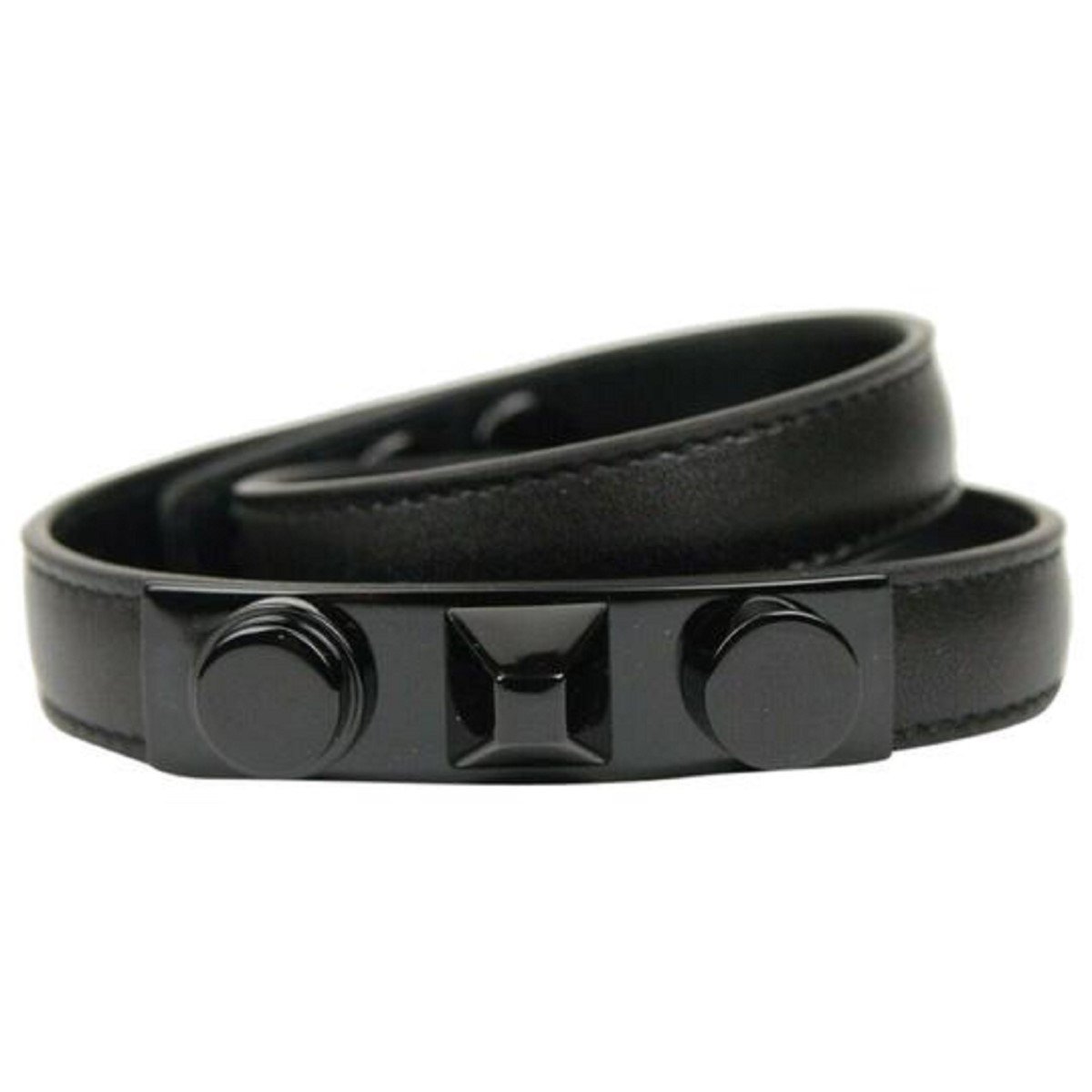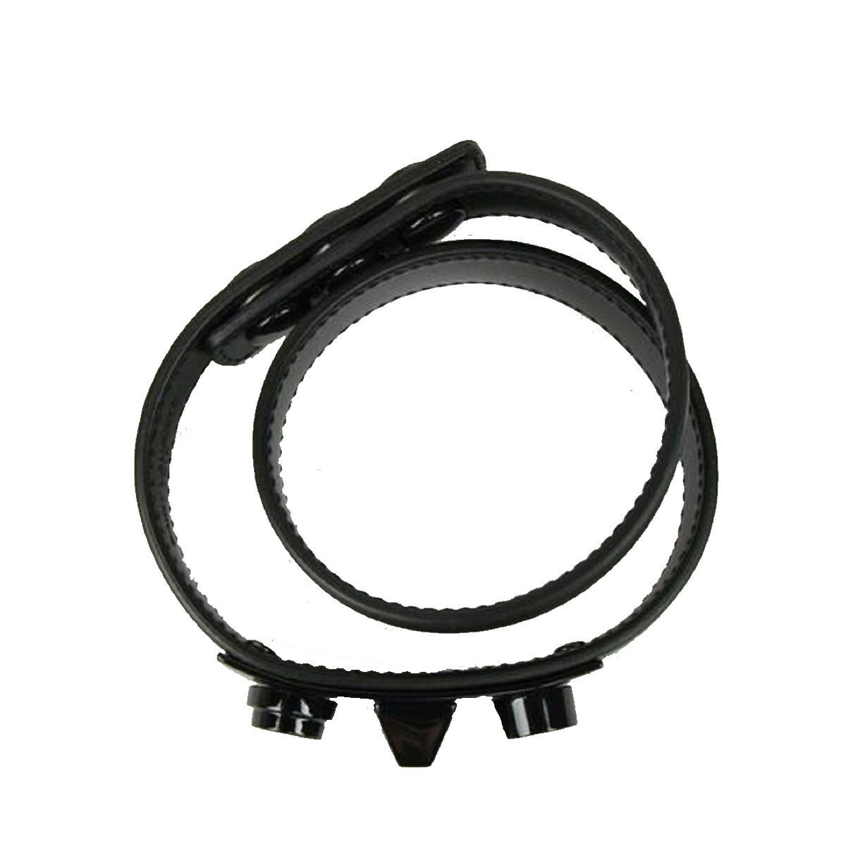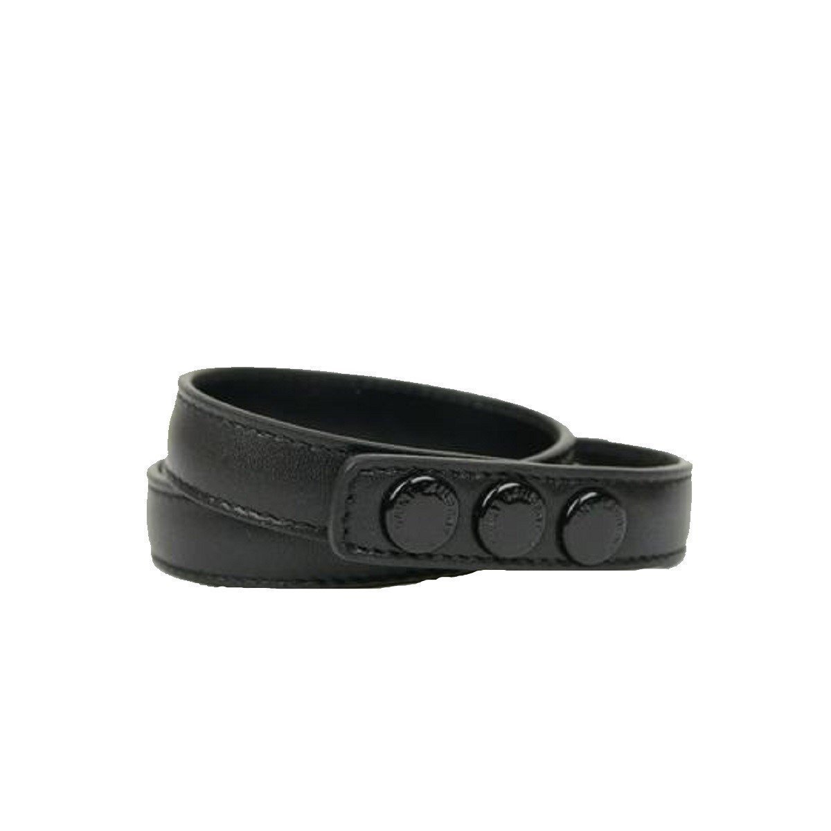 SAINT LAURENT double wrap around leather bracelet with 3 unique black metal studs: the bi-cylinder, Paris and mono-cylinder. This unisex YSL leather cuff bracelet is a stylish accessory that goes with anything you wear. Wear dressed up or down for any occasion. Its black leather and black toned hardware and studs make a sleek statement. The bracelet double wraps around your wrist and snaps in the back. The three back snaps make its size adjustable.