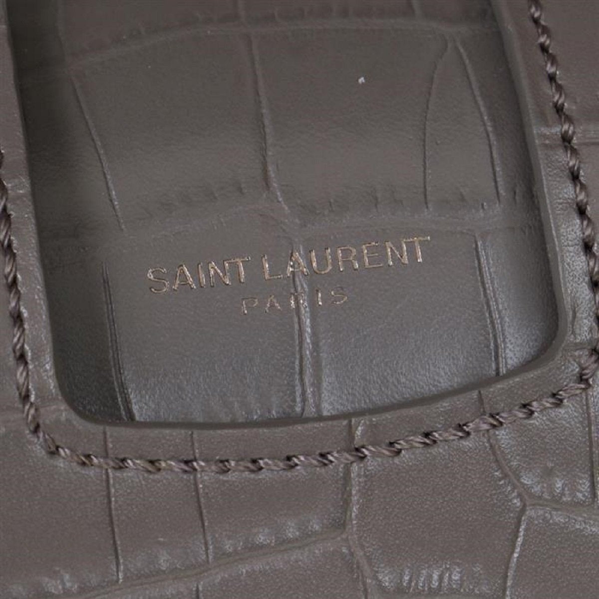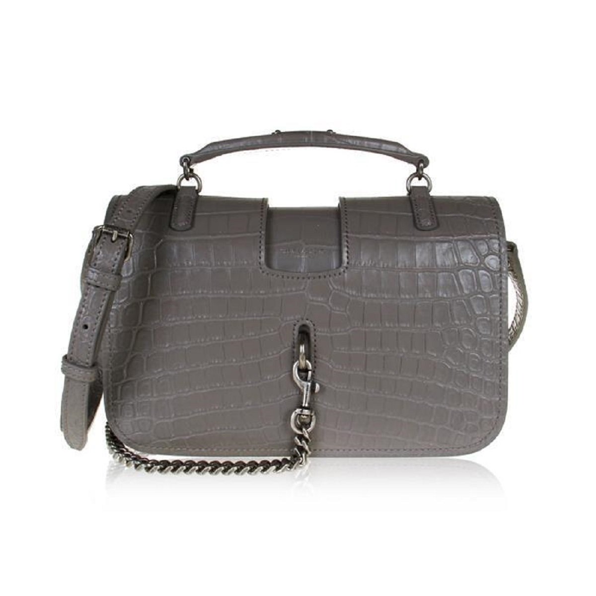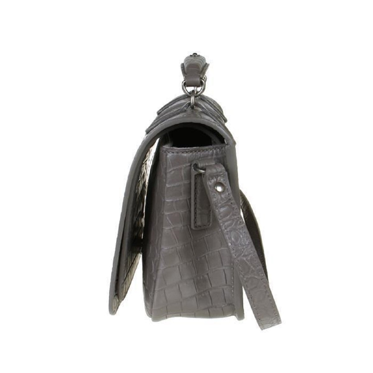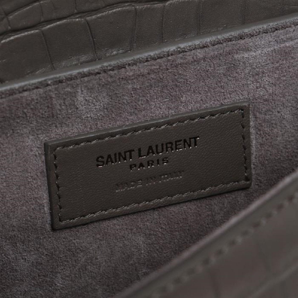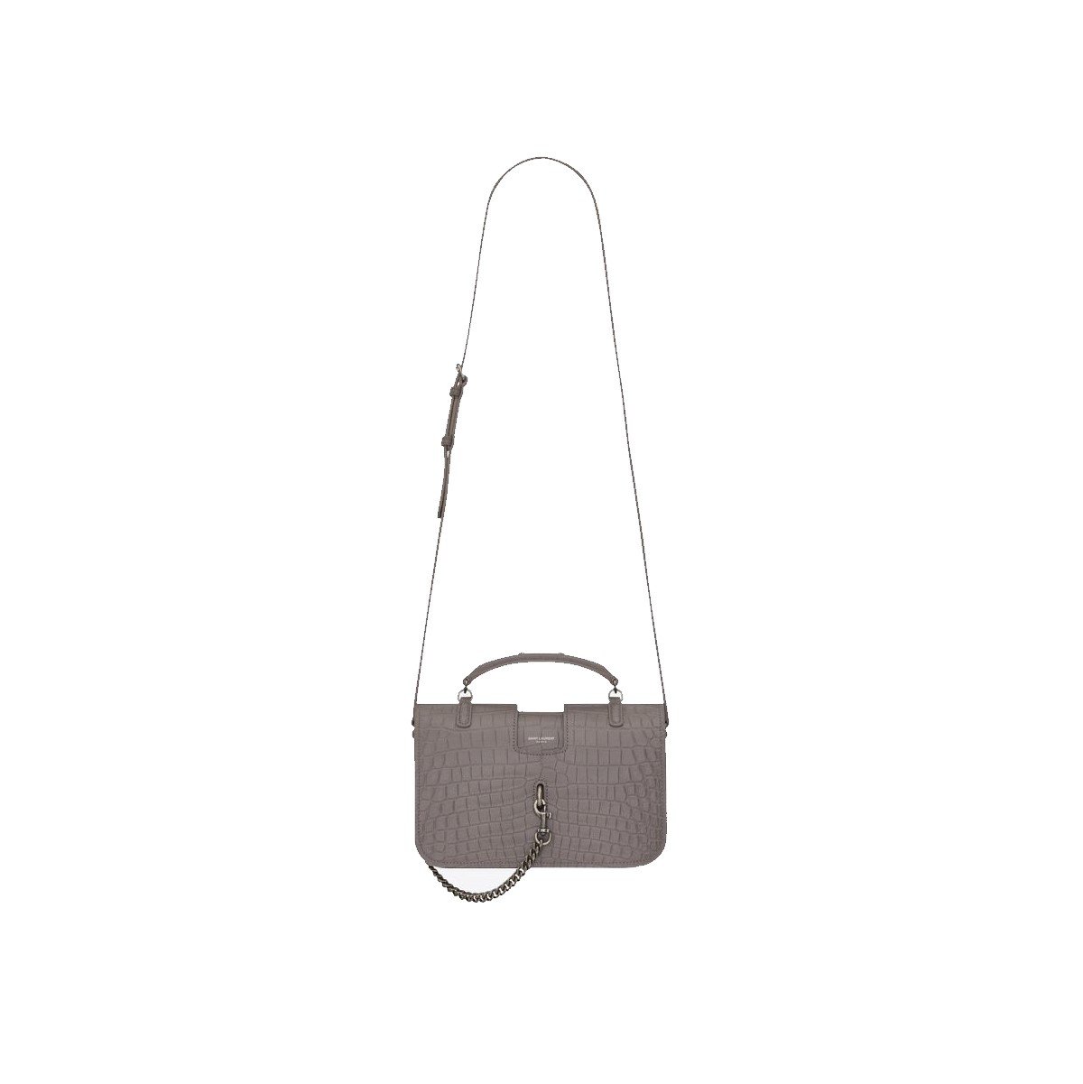 Gray 'Charlotte' shoulder bag from Saint Laurent. Size medium. Made of calf leather with crocodile skin effect. Magnetic snap fastening and carabiner clip closure. Semi-round handle. Adjustable shoulder strap. Black suede-lined interior with 2 compartments. Antiqued silver-tone metal hardware.