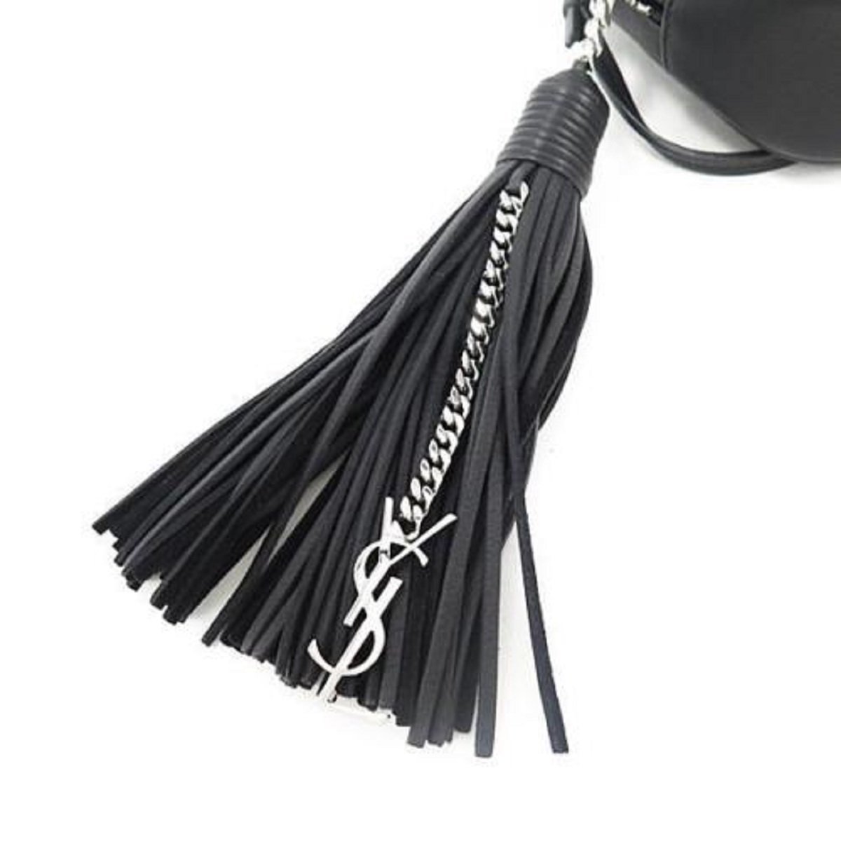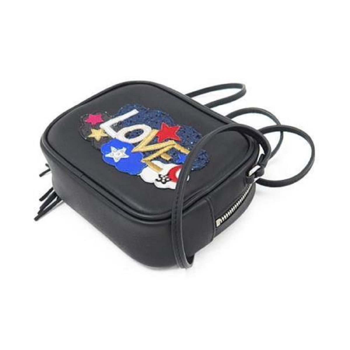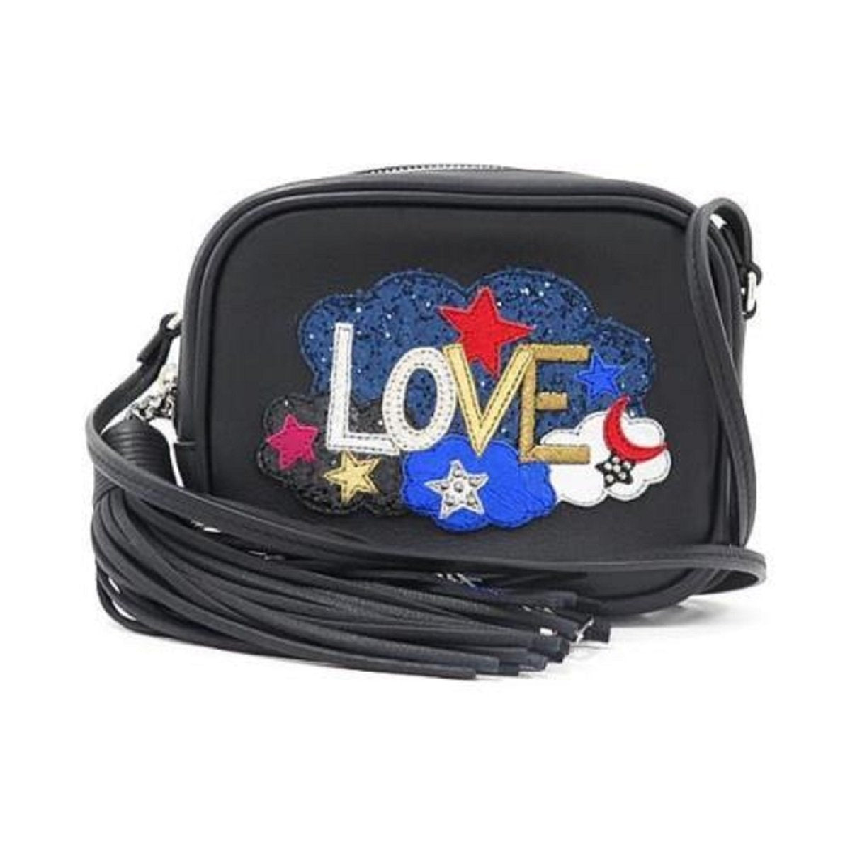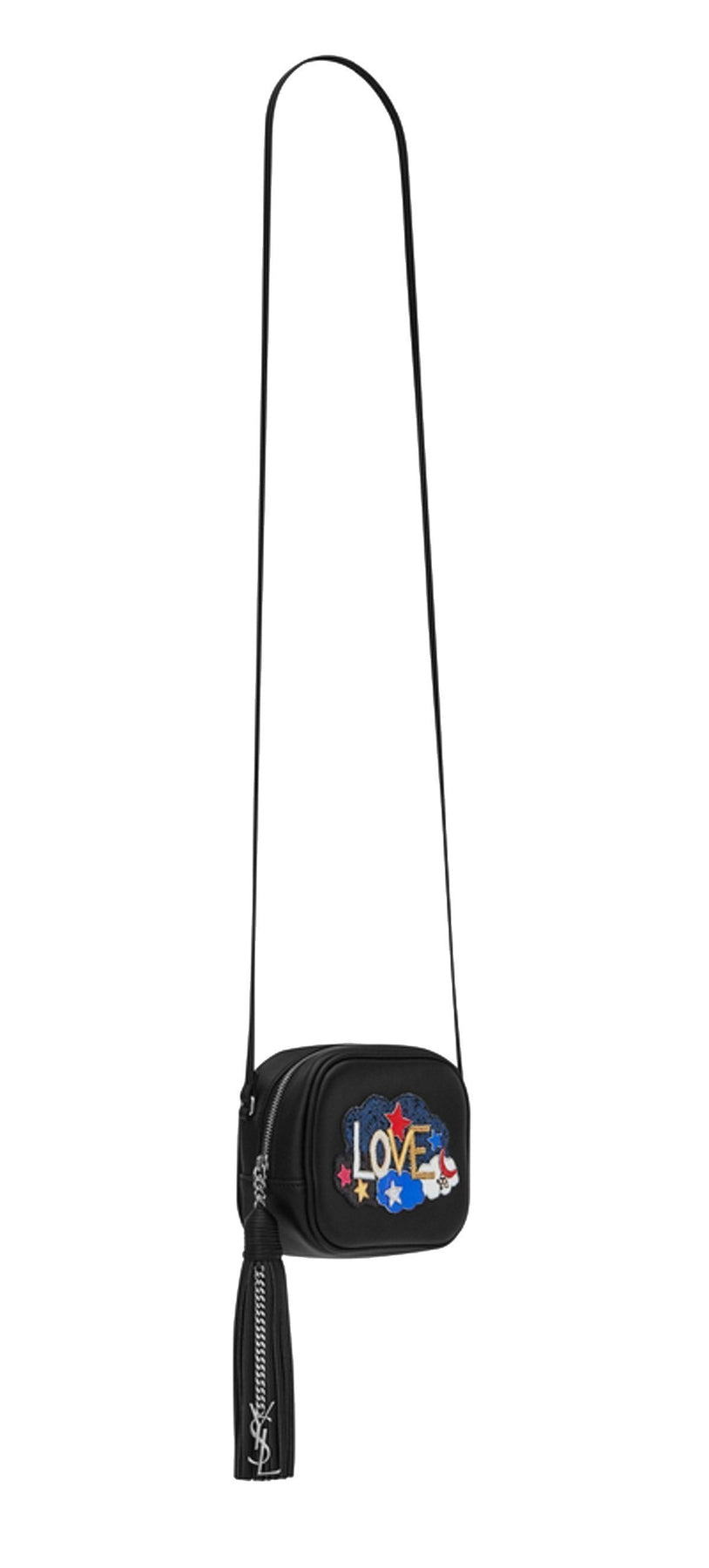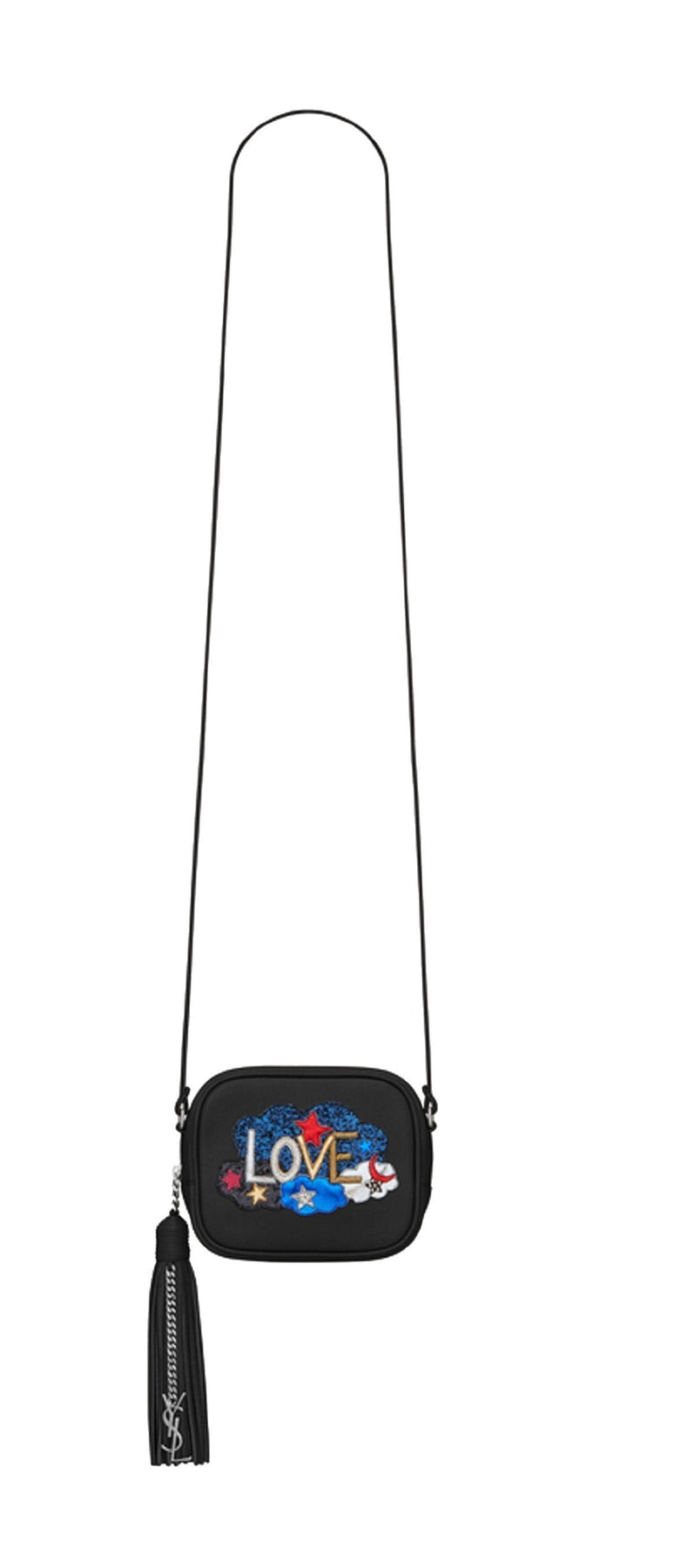 This YSL mini bag is a fun and sassy addition to any outfit. Glitter and studded Love patch with cloud, moon, and star patchwork. Full leather bag with tassel and metal interlocking YSL signature.