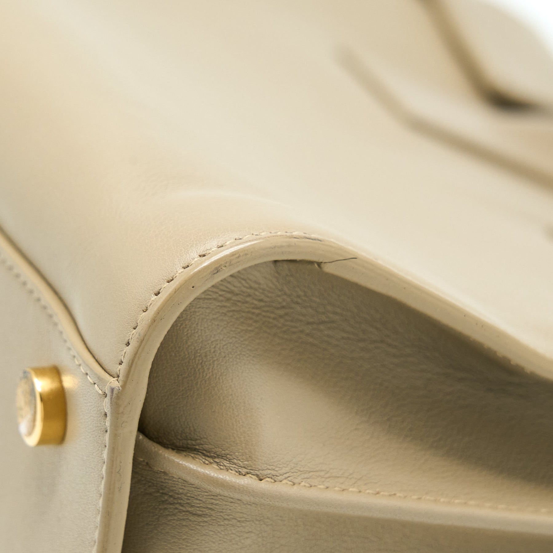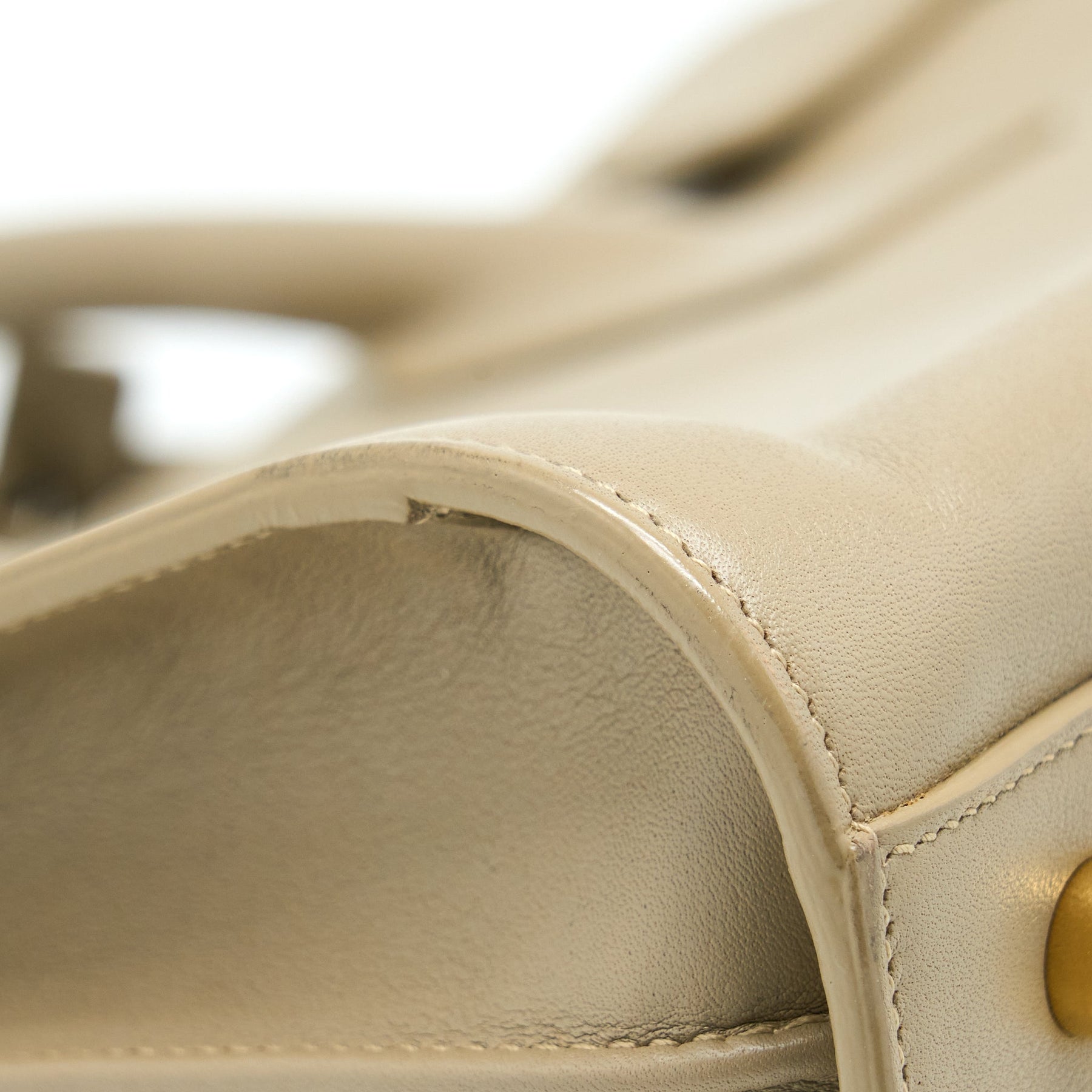 Well New (This item is in very New condition with slight scratches on leather and hardware, one tiny mark on backside leather, slight sign of use inside.)