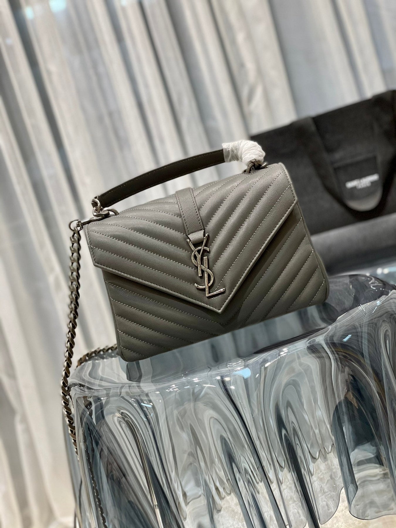 SAINT LAURENT MONOGRAM BAG DECORATED WITH CHEVRON-QUILTED OVERSTITCHING AND METAL YSL INITIALS, FEATURING A TOP HANDLE AND REMOVABLE CHAIN AND LEATHER SHOULDER STRAP. CAN BE WORN CROSSBODY.