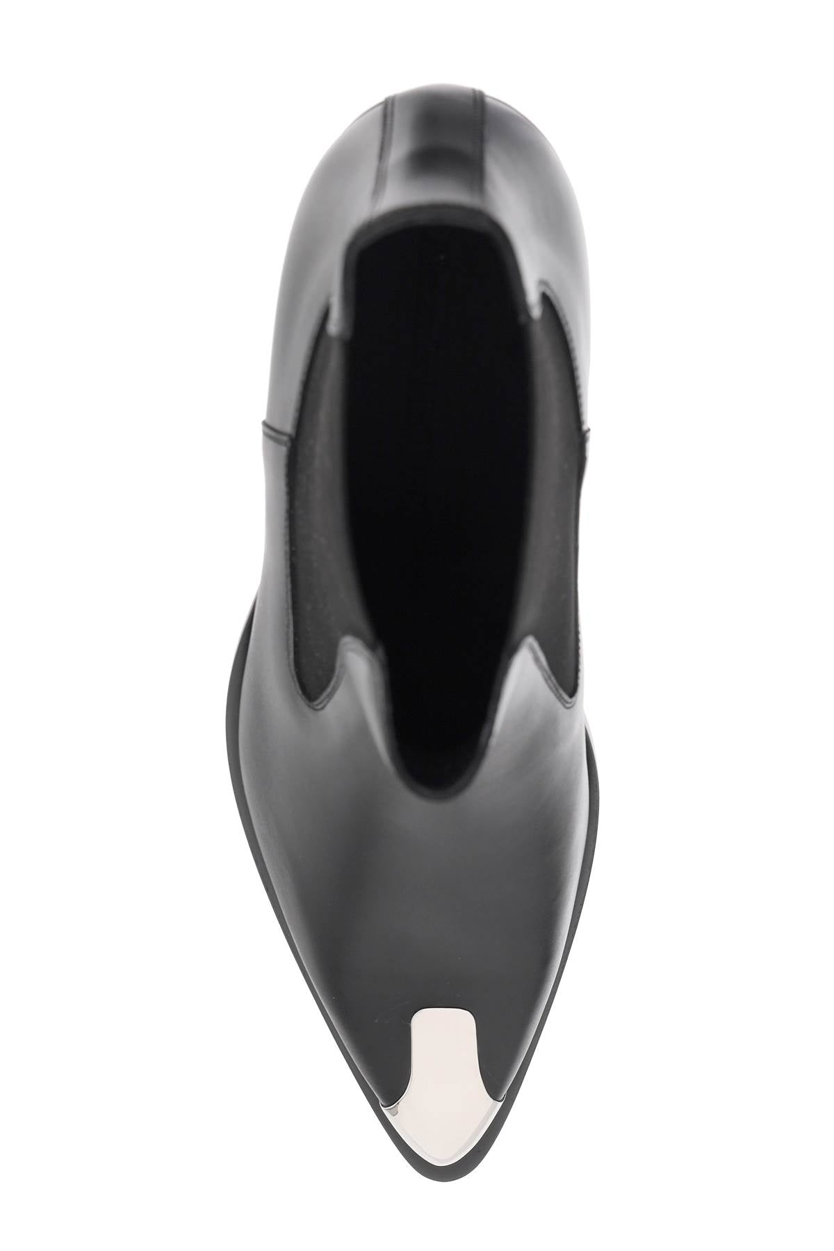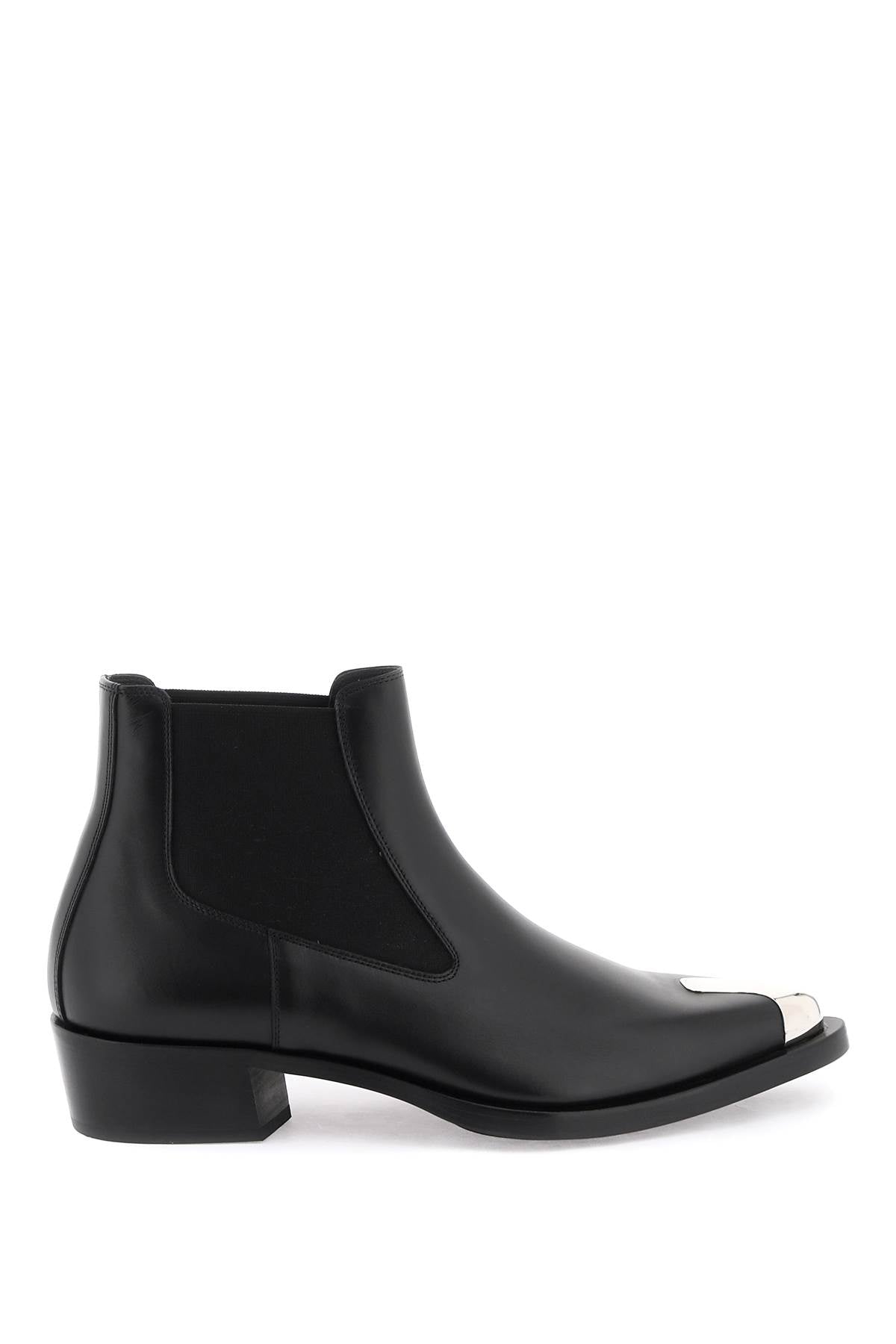 Step into the world of luxury with these exquisite Chelsea ankle boots by Alexander McQueen. Crafted from fine leather, these boots exude a sense of rebellious elegance, perfect for those who dare to stand out. The silver metal detail on the toe adds an edgy touch, while the leather interior and leather sole with rubber inlay ensure both style and comfort. Whether you're pairing them with a casual ensemble or dressing up for a night out, these punk-inspired boots are the perfect statement piece for any fashion-forward individual.